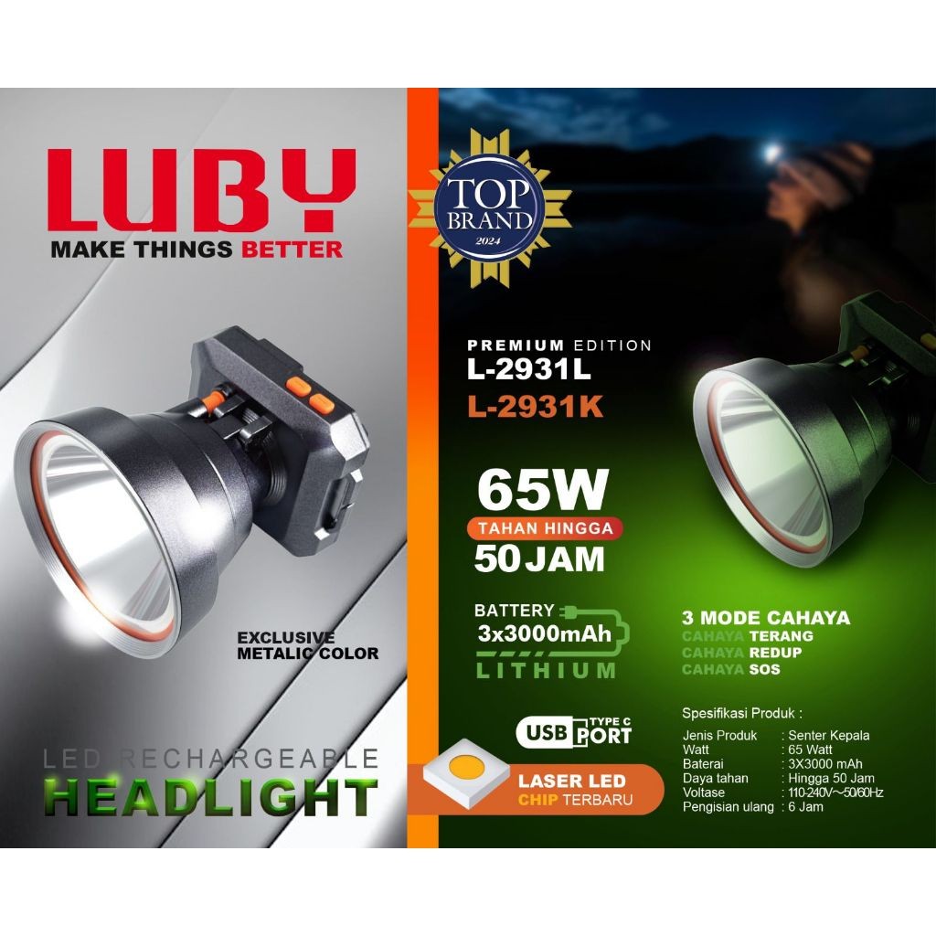 SENTER KEPALA LED LUBY L-2931L 65WATT BATERAI 9000MAH TAHAN HINGGA 50JAM - CAHAYA TERANG - JARAK JAUH - WATERPROOF