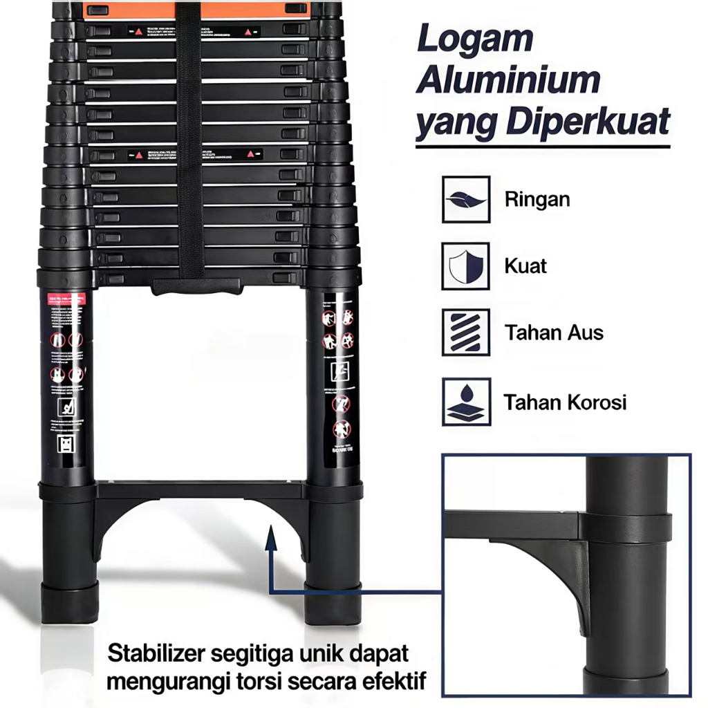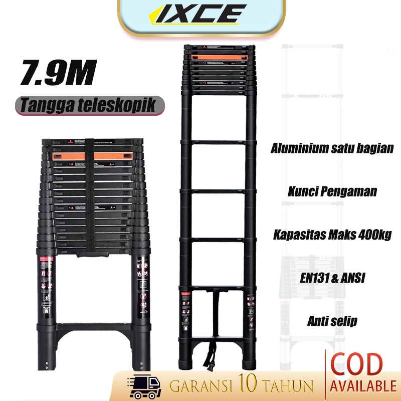 Tangga Teleskopik Aluminium IXCE 5/6.2/7/8m, Kualitas Tinggi, , Anti Karat Hitam/