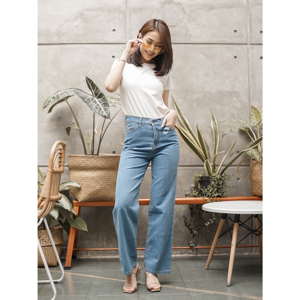 Shenelin celana panjang jeans wanita kekinian denim biru putih hitam black white denim Signature Highwaist Loose