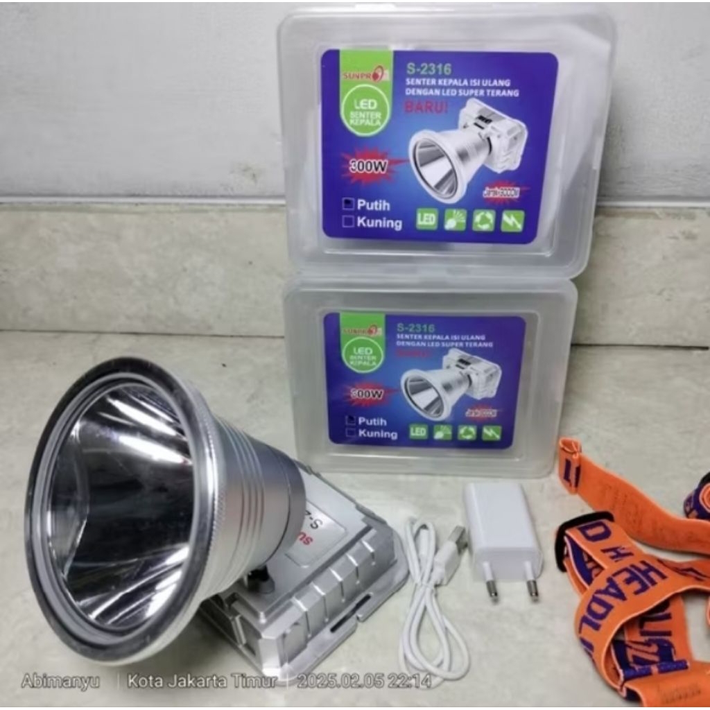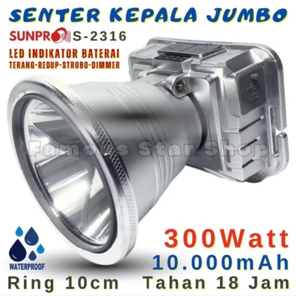 s-2316 sunpro senter kepala jumbo 300watt waterproof cahaya putih dan kuning tahan hingga 18jam 10.000mah senter kepala cass jumbo lengkap cassan