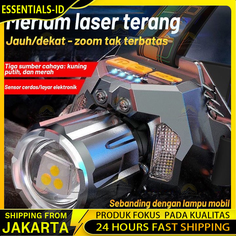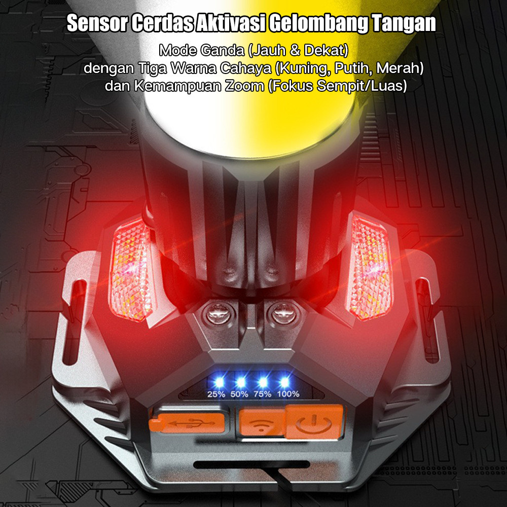 Headlamp Smart Sensor Otomatis & Zoom Adjustable 2000 Lumen - 3 Cahaya Merah/Putih/Kuning untuk Outdoor, Hiking, Camping, Patrol, Mancing Malam