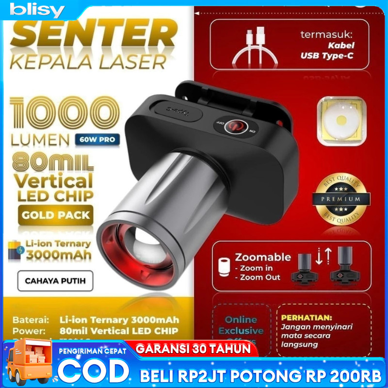 BLISY Senter kepala super terang anti air 1000 Lumen lampu senter kepala zoom super terang 60W headlamp outdoor senter kepala cahaya CAHAYA SUPER TERANG / JARAK JAUH LASER/Type C