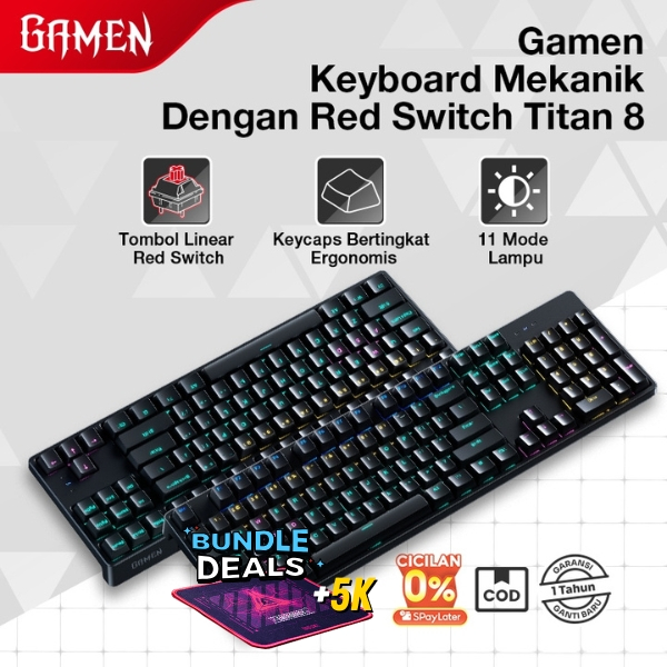 GAMEN Titan 8 Keyboard Gaming Mechanical Ergonomic Keycaps RGB 3 Pin Hot-Swappable Linear Red Switch 87/104 Keys Original - Garansi 1 Tahun