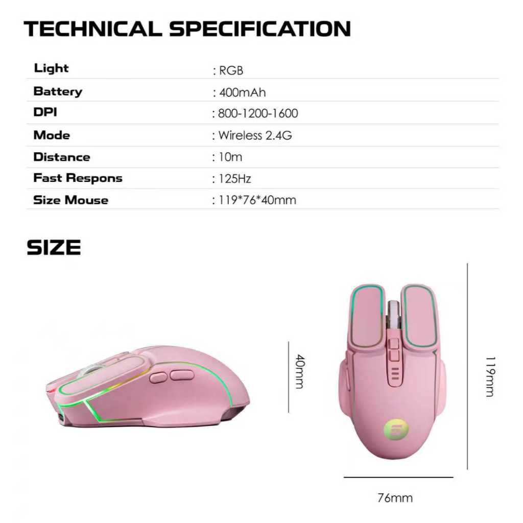 Mouse Wireless Gaming Rechargeable Type-C Fast Charging 1600DPI RGB Light GMW100