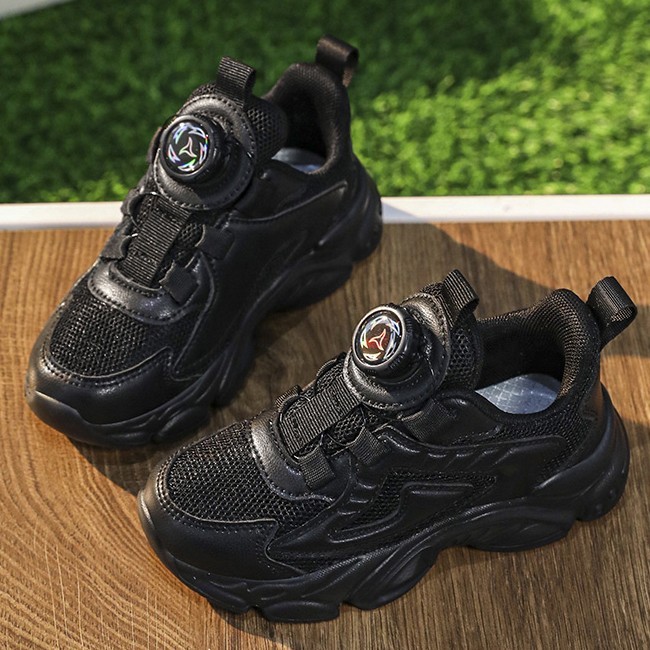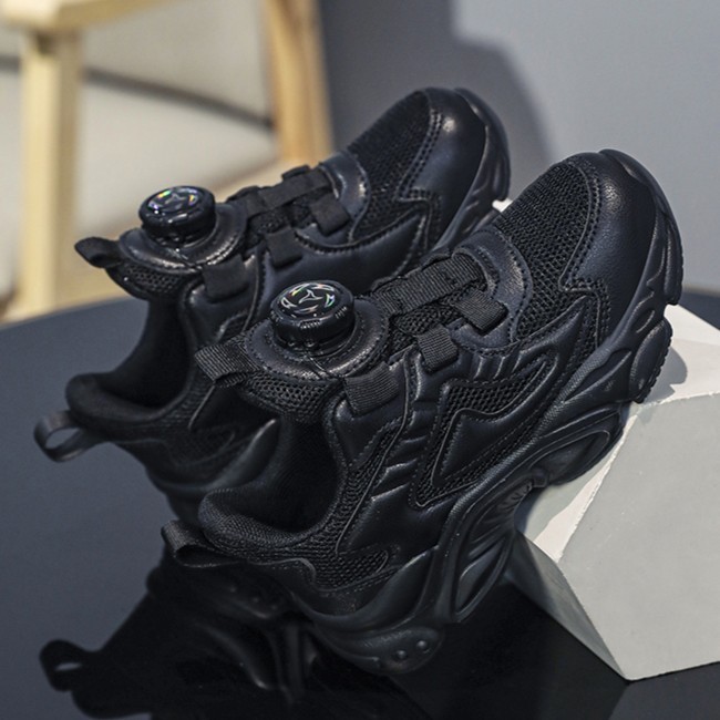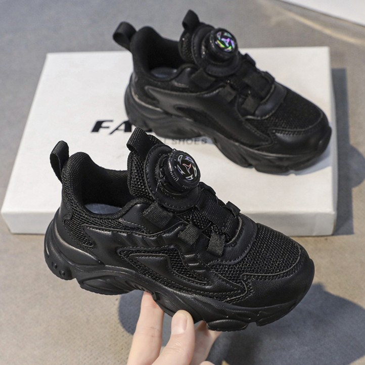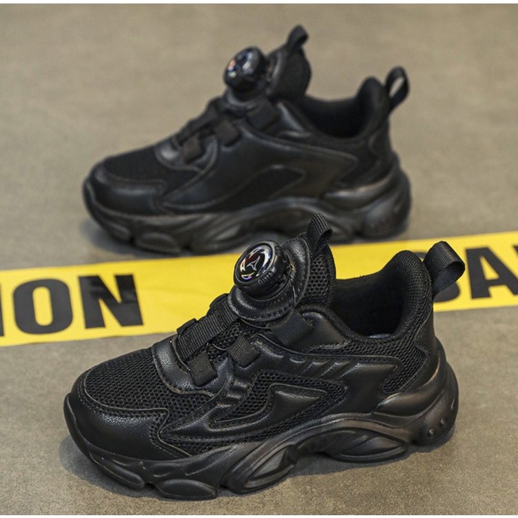 HC602 Sepatu anak serba hitam Hanya hitam Ukuran 28-39 Sepatu anak kampus Sepatu Olahraga Anak Laki-laki Sepatu kampus Tombol Kulit tahan air