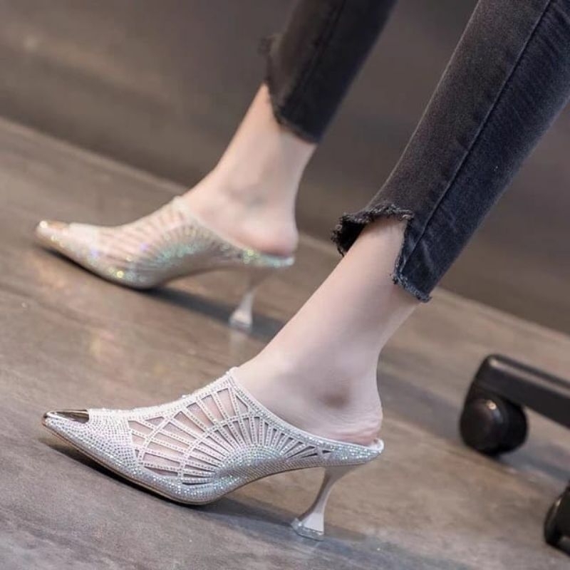 Series IP 01 Sandal High Heels Pesta Wanita Elegan Hak Lancip 7 Cm Brukat Kondangan Mewah