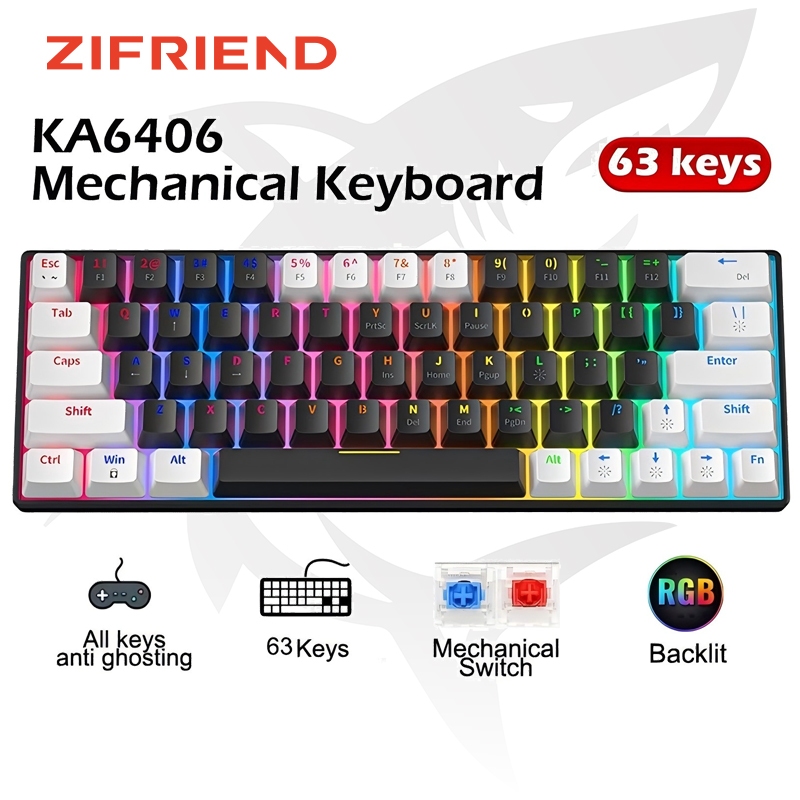 ZIFRIEND KA6406 63 Keys RGB Backlit Wired Black Mechanical Keyboard