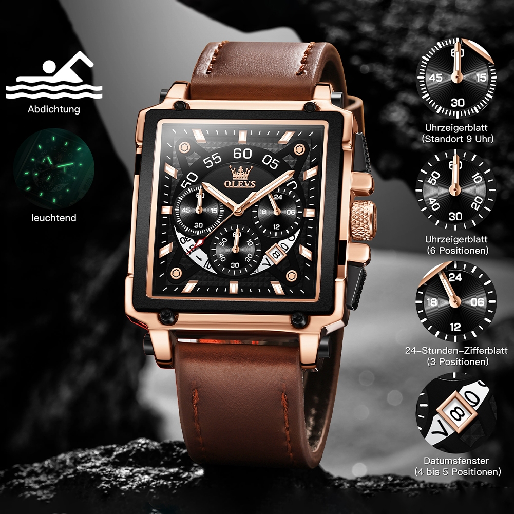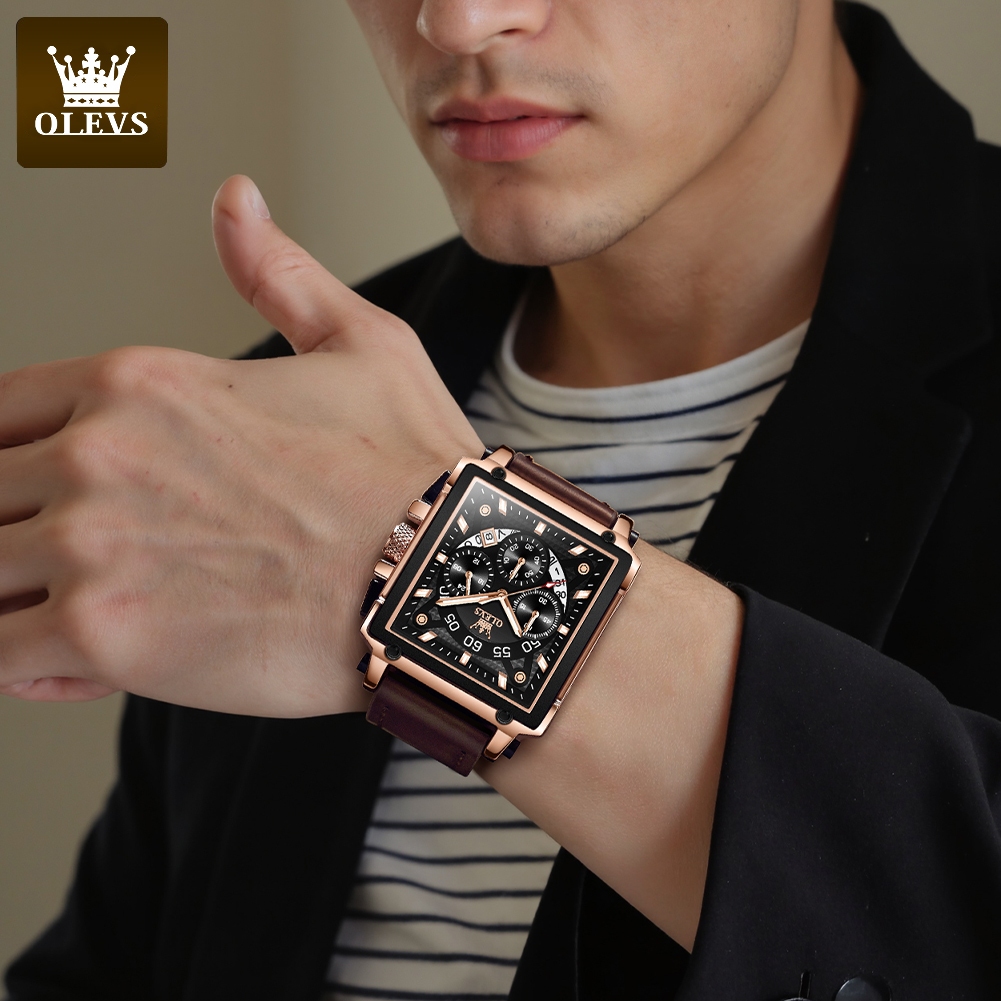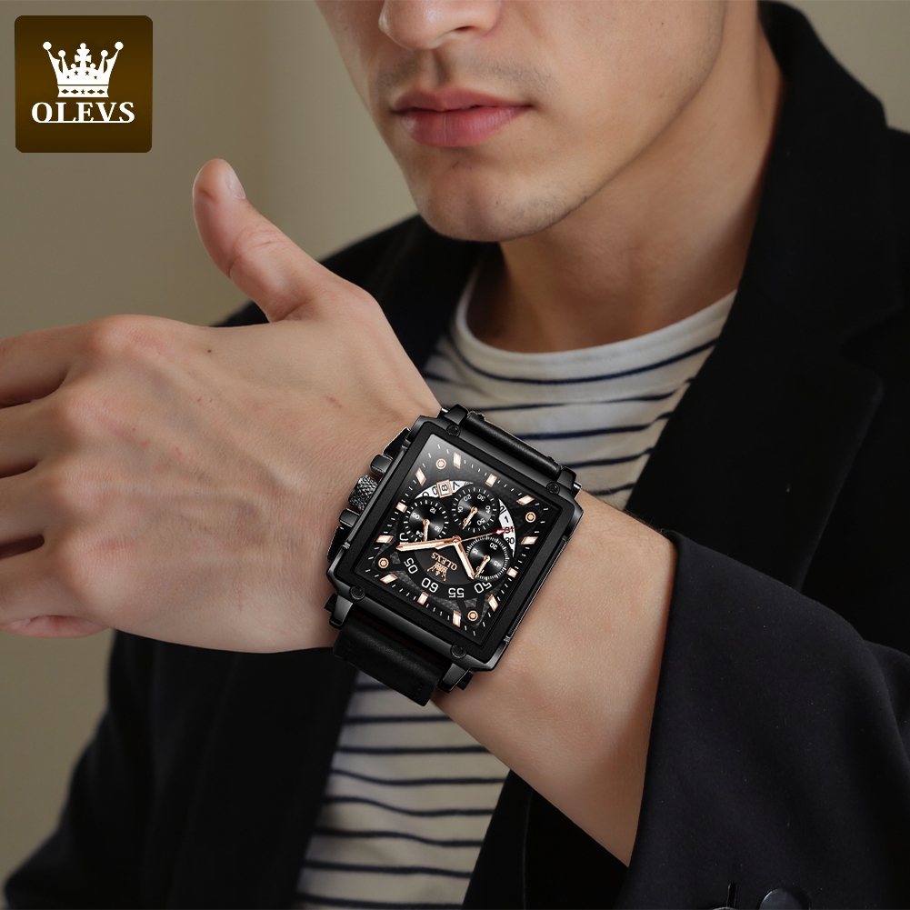 Olevs Jam Tangan Pria Kulit Anti Air Original Asli Terbaru Casual Tahan Air Square Chronograph Leather Dengan Kotak Tang