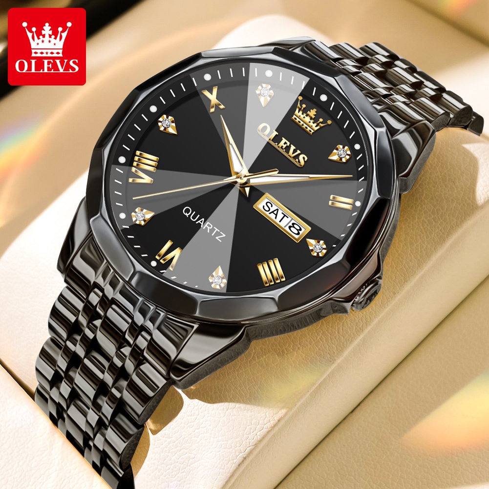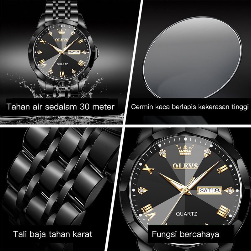 Olevs Jam Tangan Pria Anti Air Original Cowok Kalender Bercahaya Analog Luminous Stainless Steel Hitam Biru Putih Men Wa