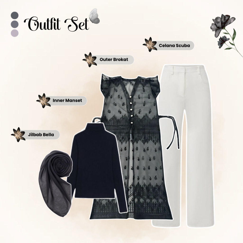 One Set Wanita Kekinian (Outer Brokat, Celana Scuba, Inner Hitam, Jilbab Bella) Kondangan - Lw66