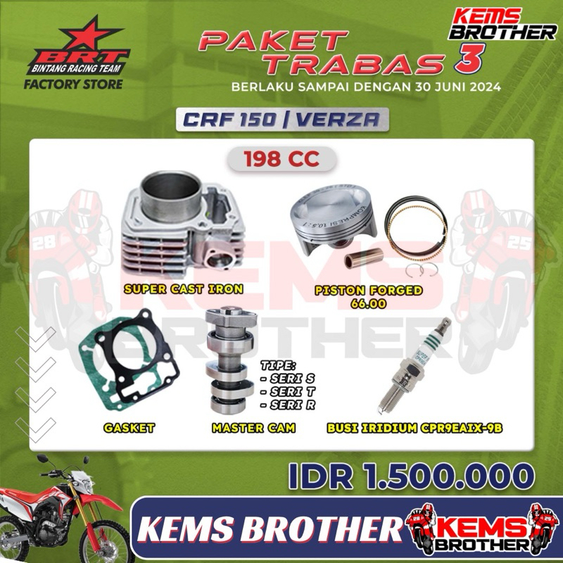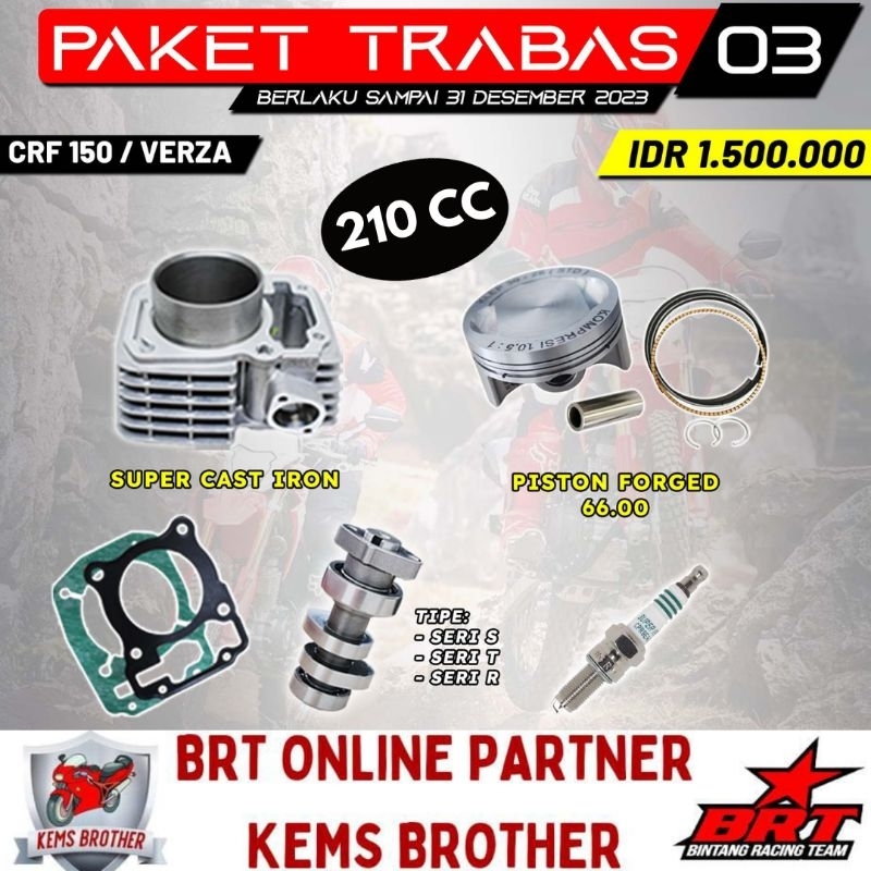 PAKET BRT CRF150 / VERZA TRABAS 3 BOREUP 198CC-210CC GRATIS BUSI RACING IRIDIUM (SILINDER BLOK CASTING IRON, PISTON KIT, NOKENAS/MASTERCAM) ORIGINAL BRT