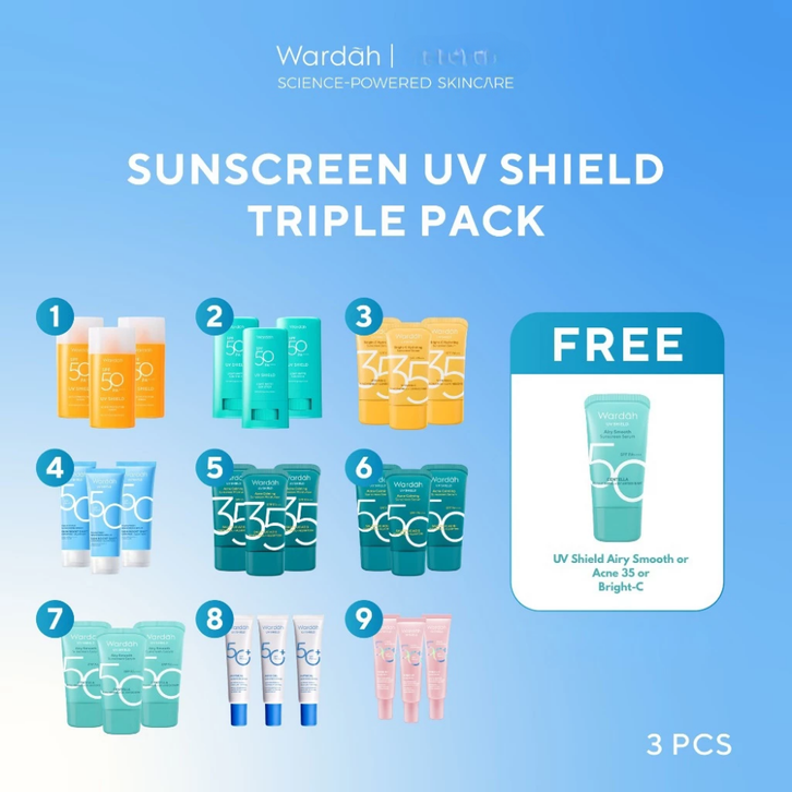 SUNSCREEN WARDAH SPF 50 35 UV SHIELD TRIPLE PACK AIRY SMOOTH ACNE AQUA ESSENTIAL GEL PAKET BUNDLE MURAH