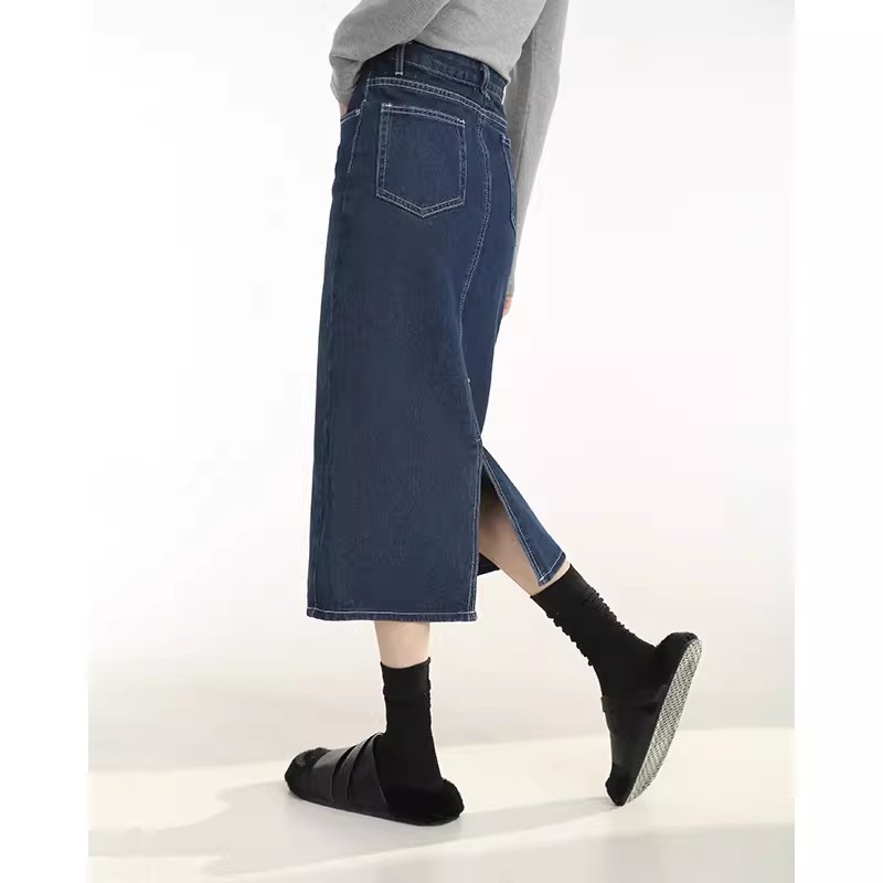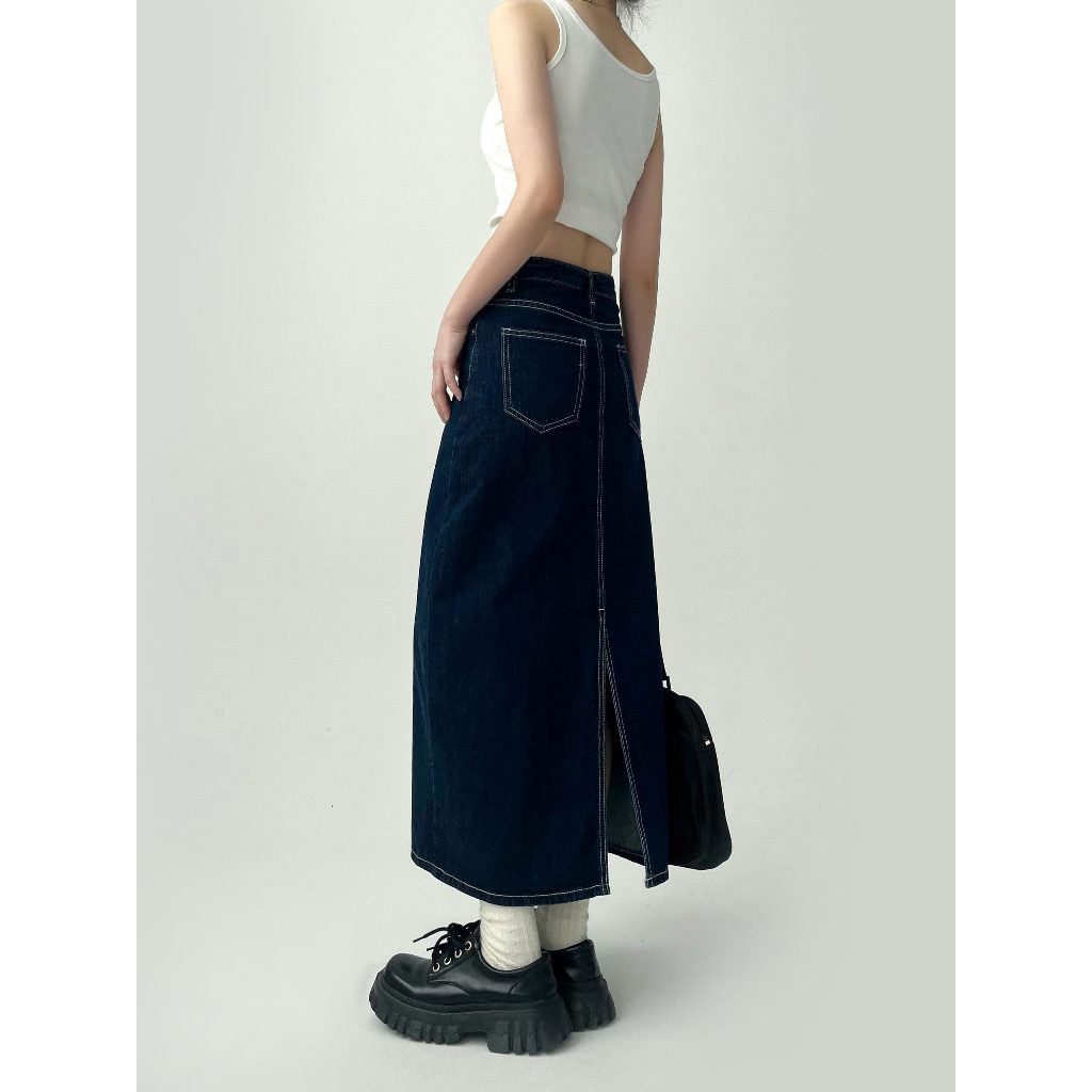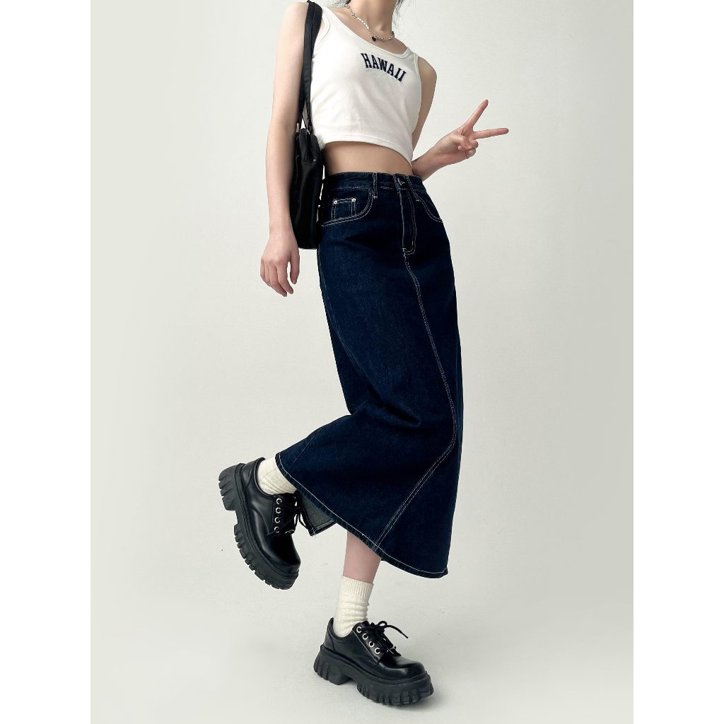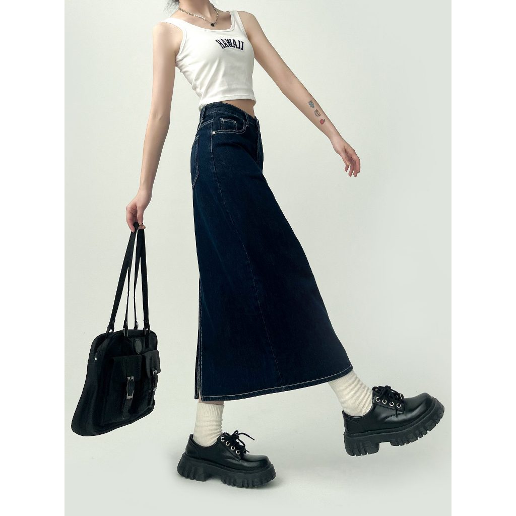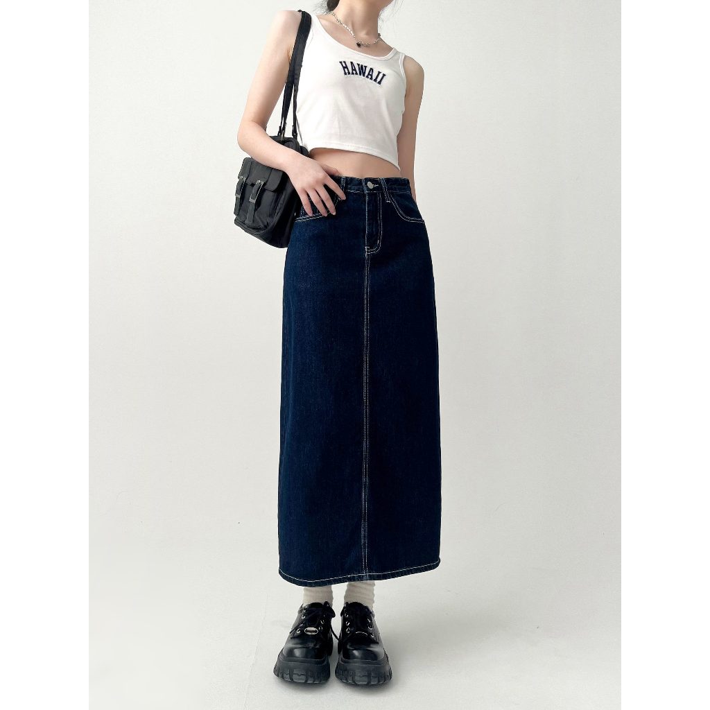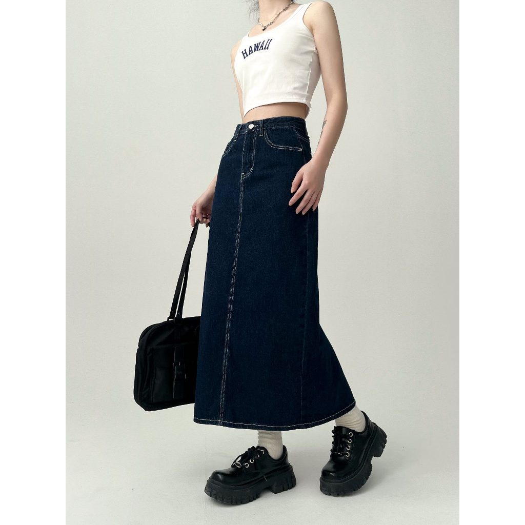 Rok Jeans Wanita Vintage Semi High Waist Slim Fit Flared Midi Skirt With Slit For Spring 2025
