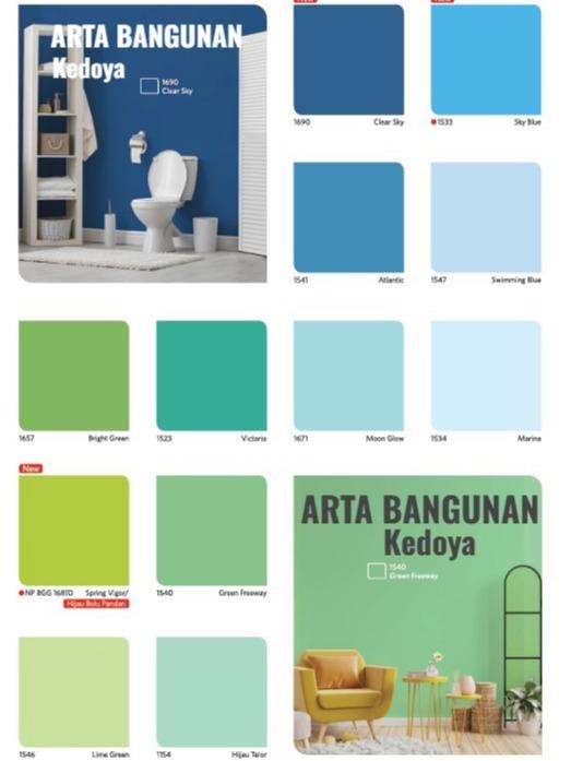 1117 Ivory, 1131 Orange Torch, 1154 Hijau Telor, 1185 Hibiscus, 1501 Extra White, 1503 Blue White, 1505 Putih, 1509 Lily White, 1514 Durian, 1515 Barley White, 1516 Sunset, 1518 Cream, 1519 Black, 1523 Victoria, 1525 Jasmine, 1526 Blue Beauty, 1529 Soft White, 1531 Goby Sands, 1534 Marina, 1539 Lakestone, 1540 Green Freeway, 1541 Atlantic, 1546 Lime Green, 1547 Swimming Blue, 1548 Stone Grey, 1549 Copper Grey, 1550 Graycloth, 1552 Pink Posy, 1553 Lavender, 1554 Happy Fuschia, 1555 Peace Blue, 1556 Cafe Latte, 1557 Sunshine, 1560 Sand Storm, 1561 Chiffon, 1562 Candy Pink, 1657 Bright Green, 1671 Moon Glow, 1688 Real Morado, 1690 Clear Sky, SP 1533 Sky Blue, SP 1684 Lemon, SP 1691 g00lden Honey, SP BGG 1681D Spring Vigor