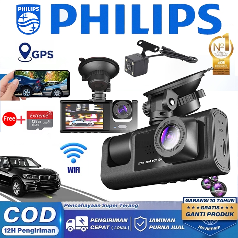 PHILIPS 3 Lens Dashcam 128GB HD 1080P WIFI dashcam mobi Kamera Dash Kamera Dashcam Lensa Loop 24 Jam