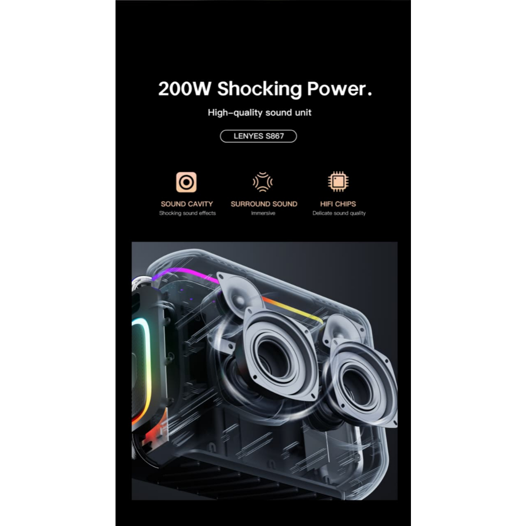 LENYES S867 200W Outdoor KTV Wireless Speaker + Microphone Karaoke Bluetooth 5.3 High Power Bass Subwoofer RGB Light