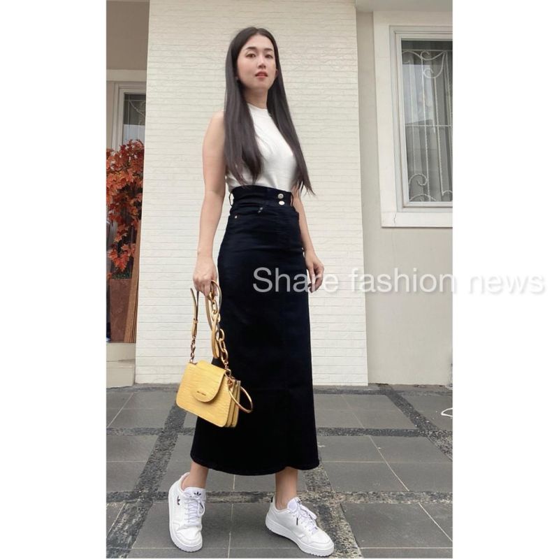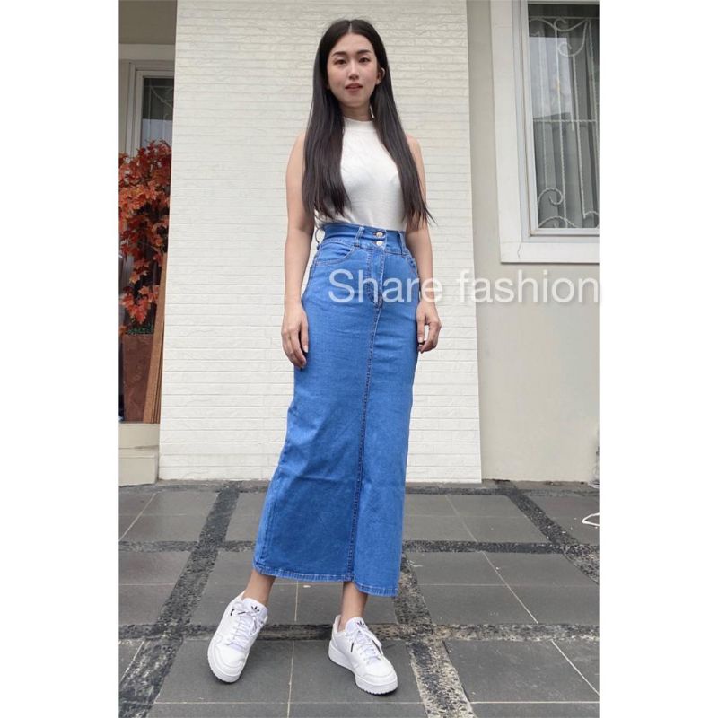 Rok Jeans Kancing 2 High Waist | Rok Span Panjang 7/9 | Rok Jeans Premium