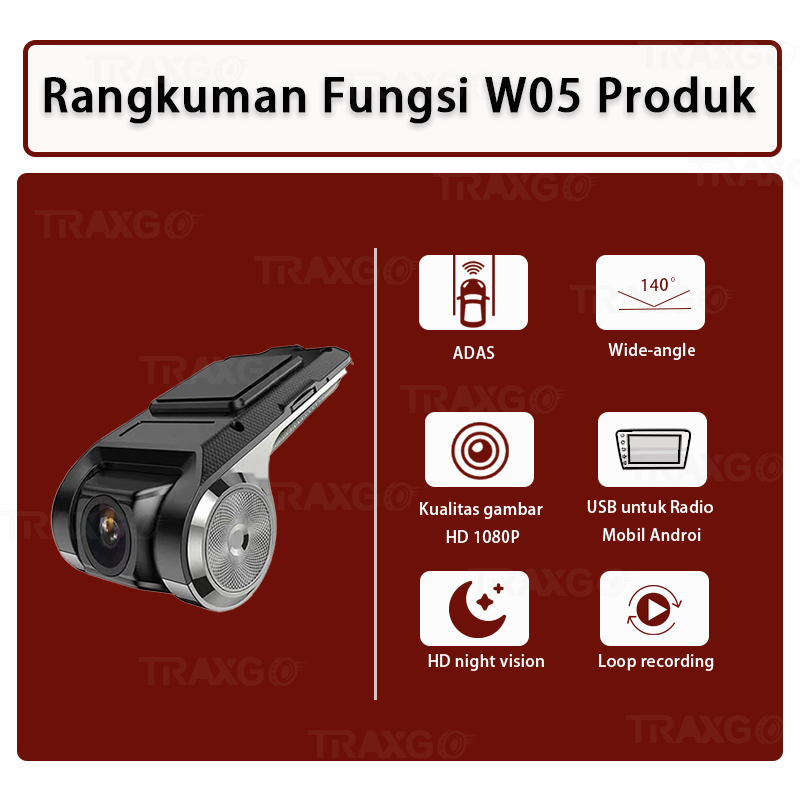 W05 Dash Cam 1080P FHD Lensa Sudut Lebar Mobil + Peringatan ADAS, Pengisian Cepat USB dan Android DVR