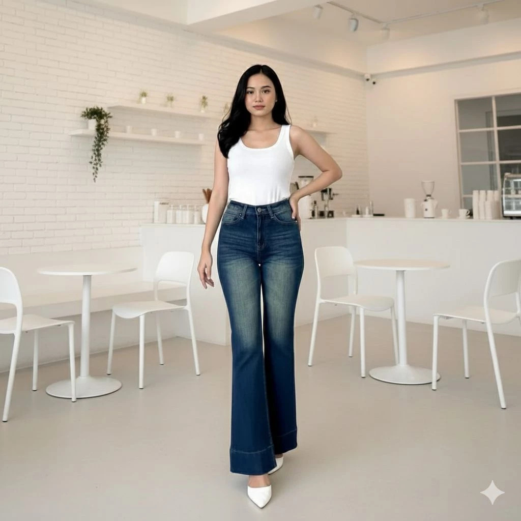 Celana Cutbray Jeans Janita Higwaist Lipat Kaki Besar Jeans Strech Wanita Bawah Lebar Kekinian