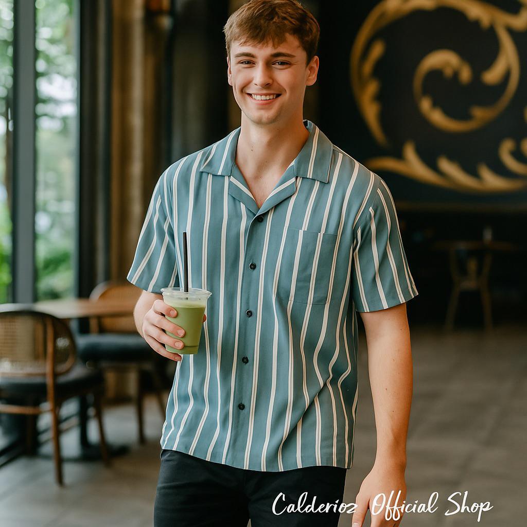 Calderioz - Baju Kemeja Hawai Pantai Bali Lengan Pendek Cowok Cewek Motif Salur Biru Putih