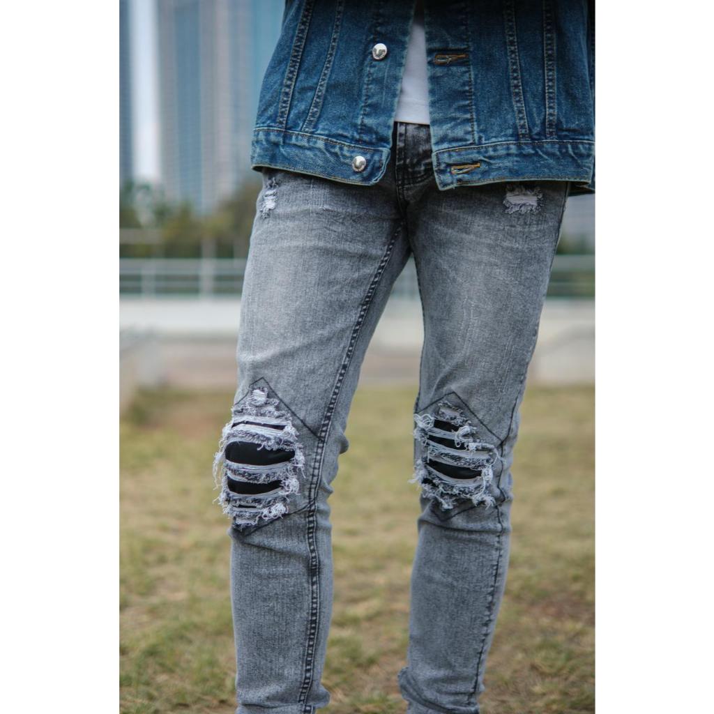 Weird Jeans - Sky Grey - Celana Jeans Panjang Pria Slim Fit Strech Ripped Warna Abu-Abu Nyaman