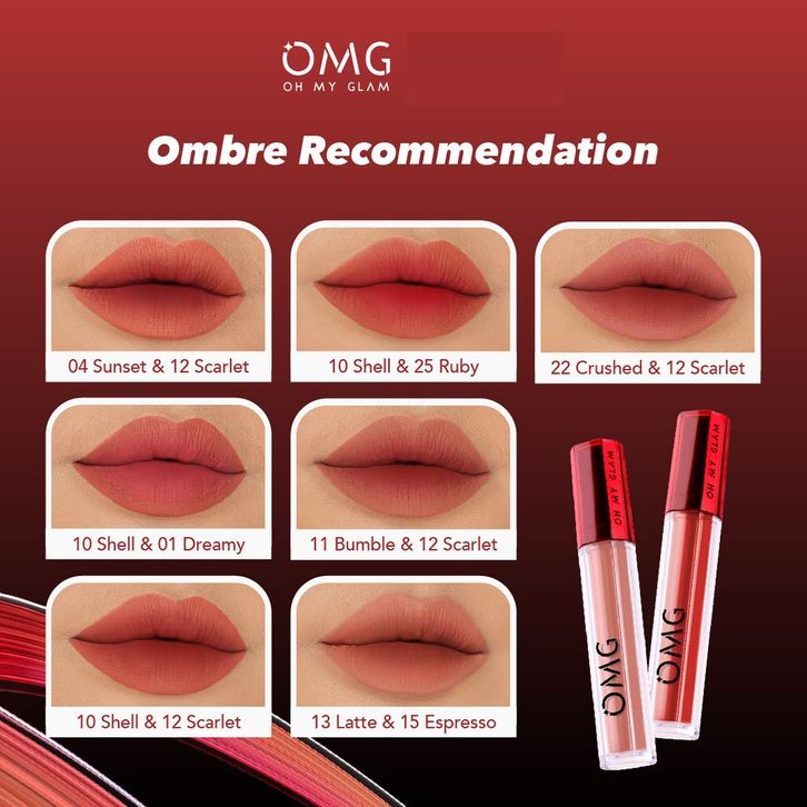 Bold Rosewood 23+03, Cherry Lover 04+06, Cinnamon Deep 14+05, Coral Move 10+04, Mauve Glow 18+05, Mocha Glam 28+08, OMG 01 & 10, OMG 04 & 12, OMG 04 & 27, OMG 10 & 12, OMG 10 & 25, OMG 11 & 12, OMG 13 & 01, OMG 13 & 12, OMG 13 & 15, OMG 14 & 15, OMG 22 & 12, OMG 22 & 24, OMG 23 & 01, OMG 28 & 15, Red Rebel 13+04, Rose Gold 13+05, ScarletTakeovr 22+03, Slaying Nude 18+04, Spicy Red 22+05, Tangerin Like 13+06, Tulis Di Catatan/Mix