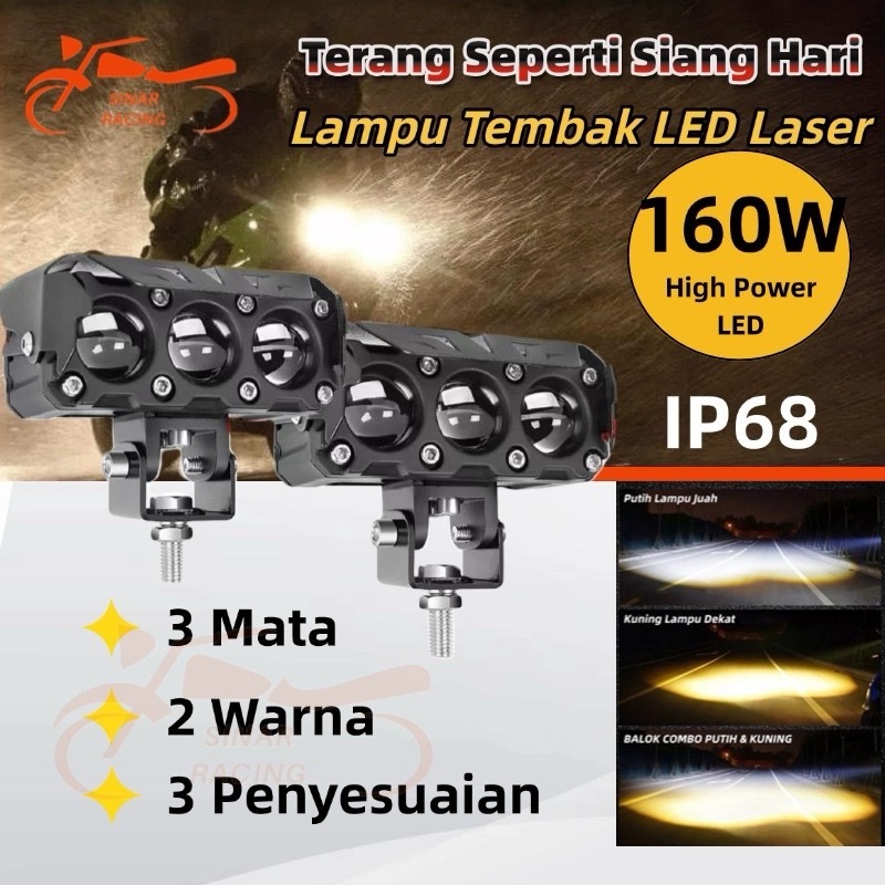 Sinar Racing Lampu Motor LED Super Terang 3 Mata 160W Waterproof IP68 Putih Kuning 100.000 Jam