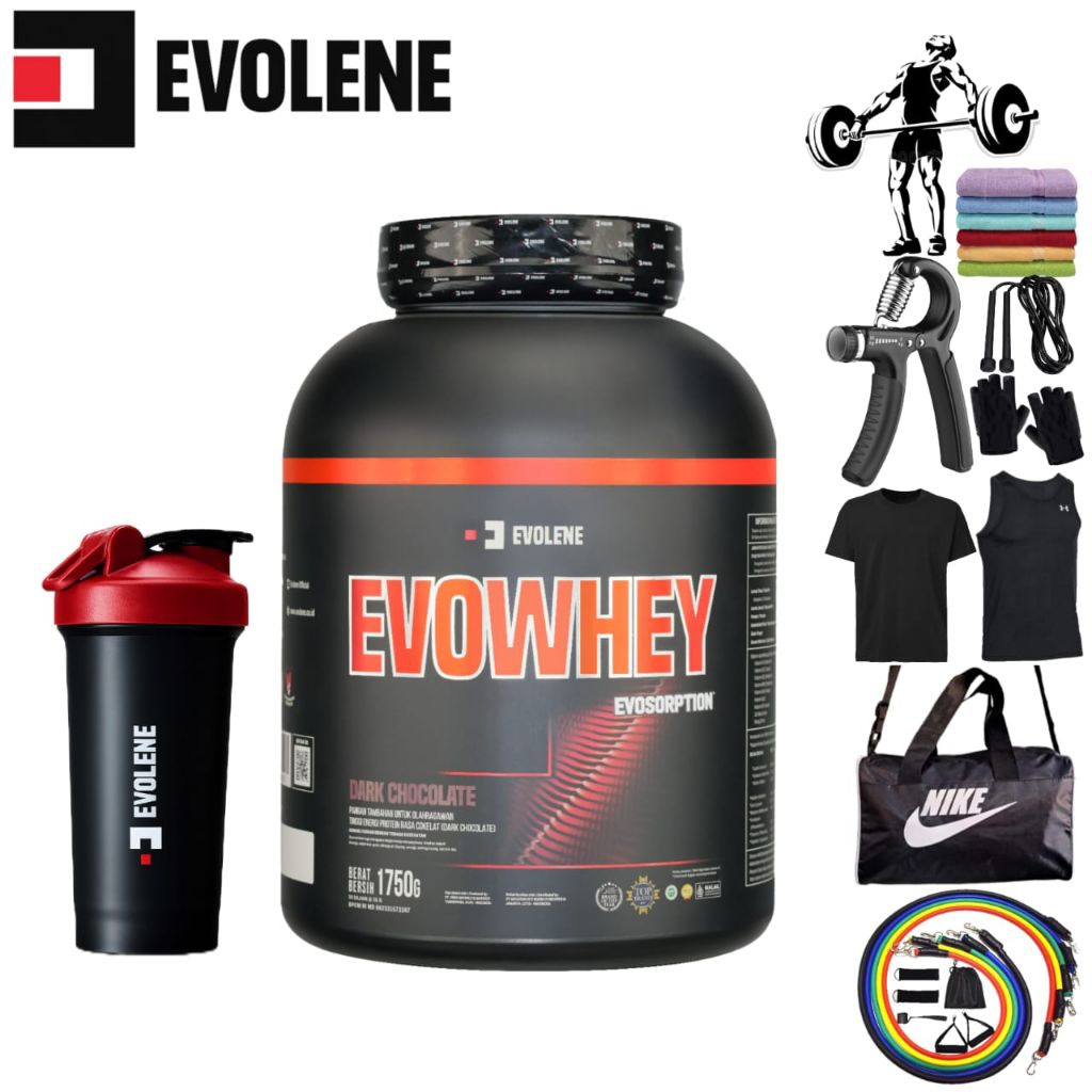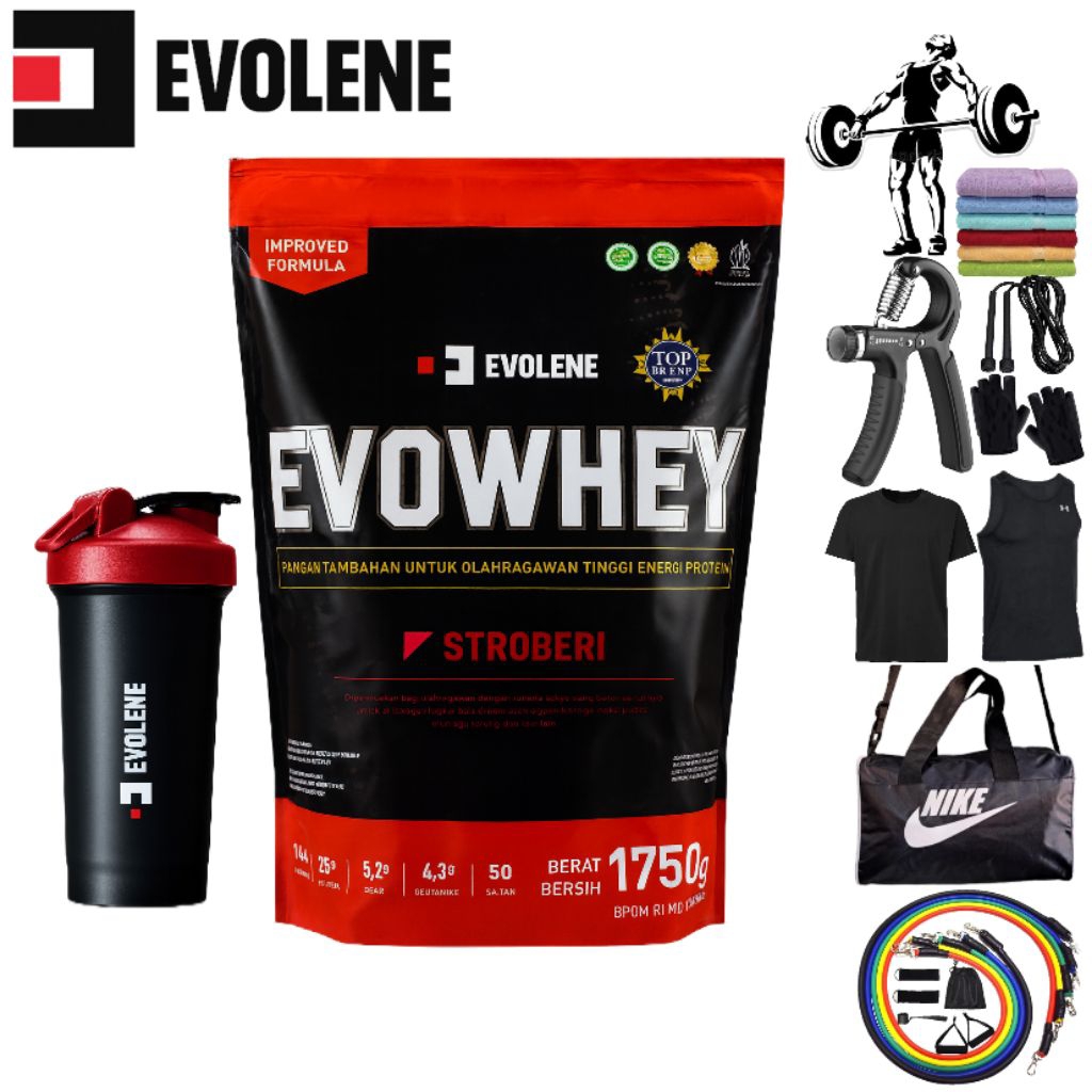 SHAKER ORI EVOLENE, SHAKER+SINGLET+GLOVE, SHAKER+TAS GYM+GLOVE, TASSEPATU+GLOVE+KAOS, BOTOL+KAOS +GLOVE, PREVO 5 sachet, Snack FITBAR 6Pcs, KAOS+SINGLET+GLOVE, RESISTANCE BAND 1SET, BEBAS PILIH 3 HADIAH