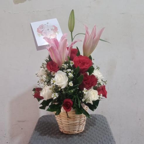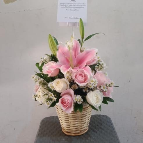 RANGKAIAN BUNGA MAWAR PUTIH MIX PINK FRESH MIX BUNGA LILI WANGI DI RANGKAI DI VAS ROTAN
