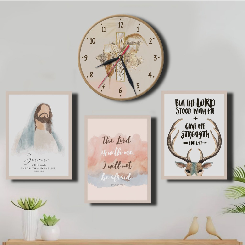 Jam Dinding Salib 1 SET Hiasan Dinding Kristen Gambar Yesus/ Poster Kayu Rohani Ayat Alkitab Kado