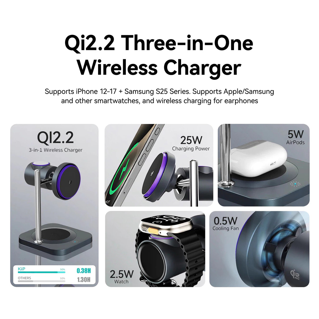 Kiip W10 Qi2.2 3In1 Magnetic Wireless Charging Stand Fast Charging 25W Smart Touch Control Built-In Cooling Fan
