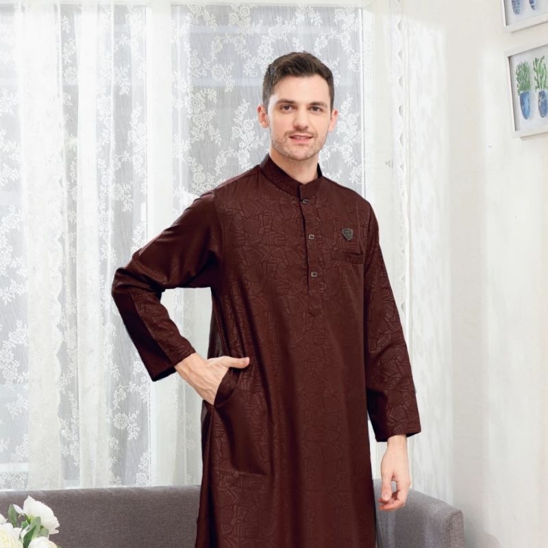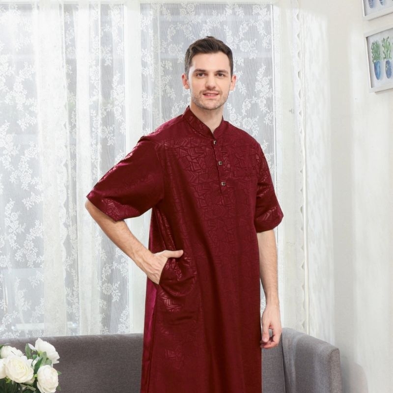 Family Muslim - Jubah Pria Dewasa Lengan Pendek Slimfit Motif Emboss Al-Muhajir Navy