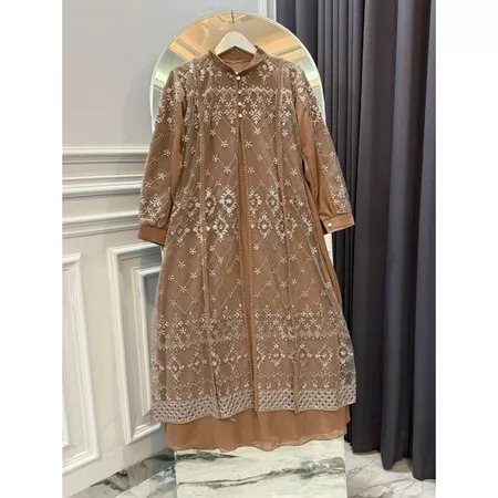 gamis wanita terbaru 2026 Gamis Kondangan Brukat Tile Warna Mahogany Denara Dress Ceruty Armani Full Puring Mix Payet Sw