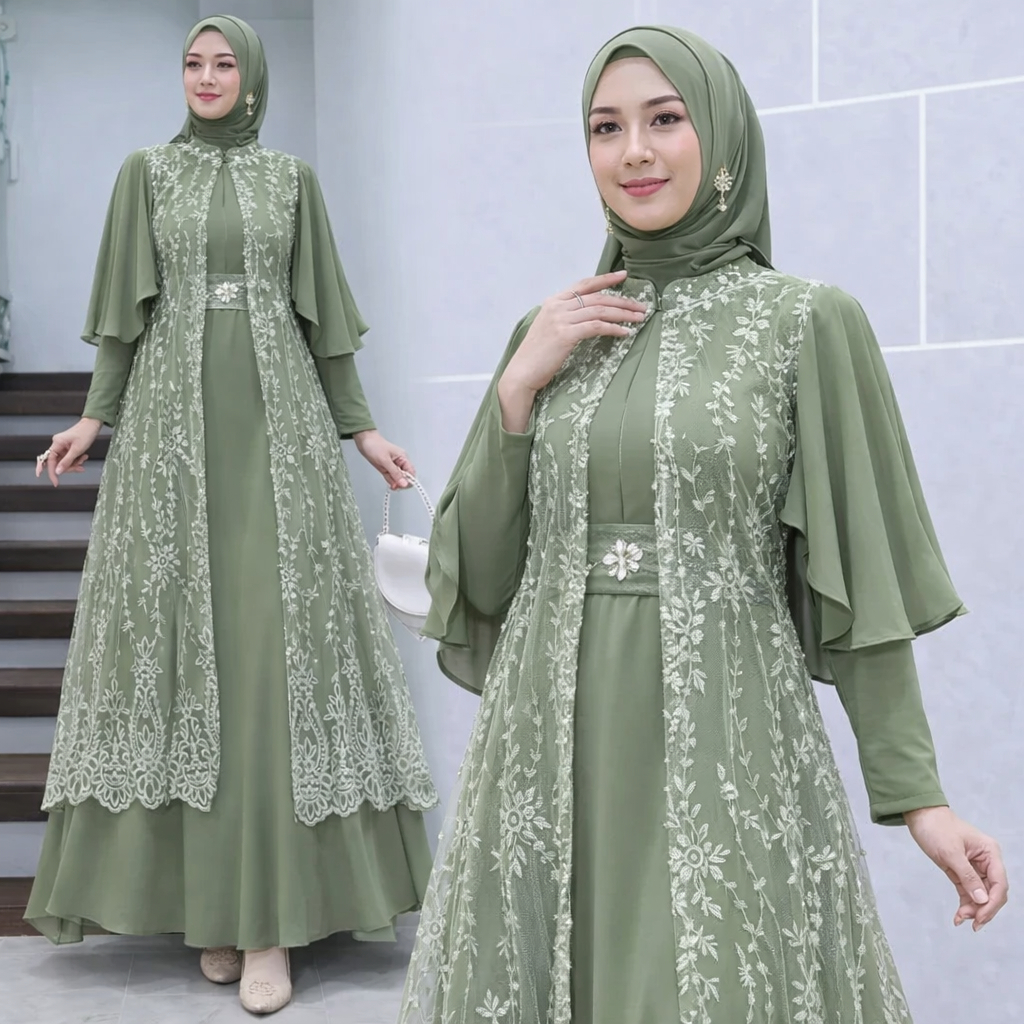 Vallina Outfit Clarisa Maxy Dress Brokat Outer Pisahan Gamis Muslim Wanita Lebaran Kondangan Premium
