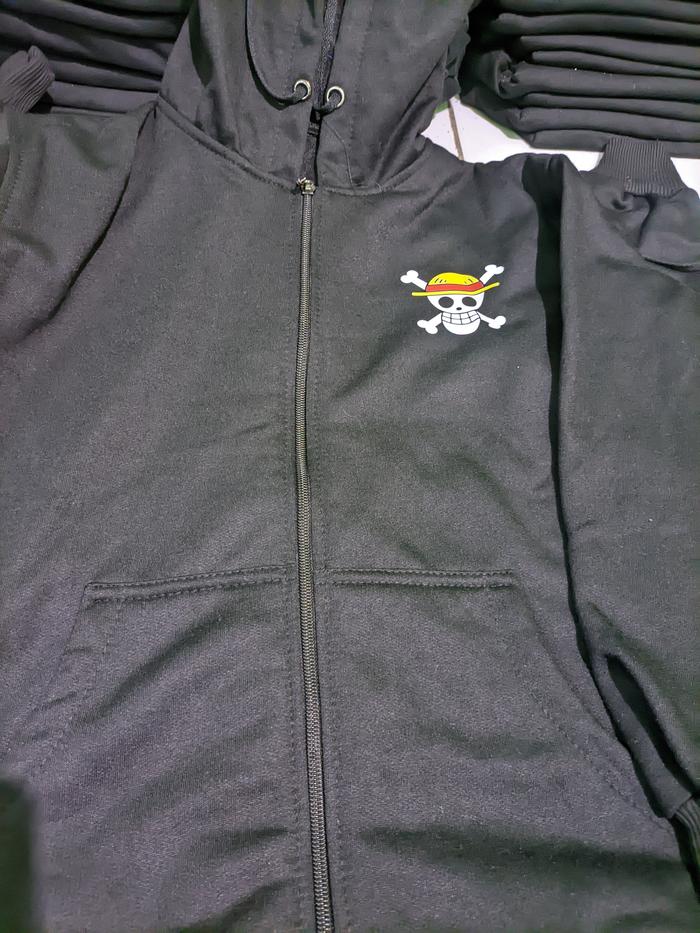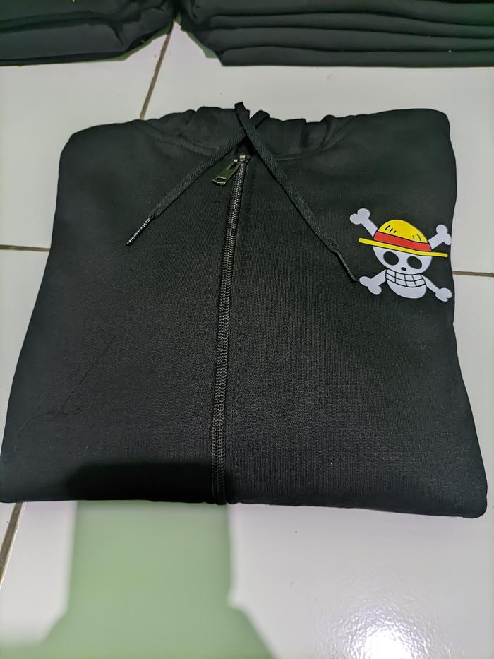 JAKET HOODIE RISLETING ZIPPER ANAK LAKI LAKI FLEECE HITAM LOGO KAPAL BAJAK LAUT MUGIWARA ONE PIECE TOPI JERAMI / MONKEY D LUFFY / MODE GEAR 5 JEANS SWEATER FASHION - TOPI JERAMI, M (4 TAHUN)