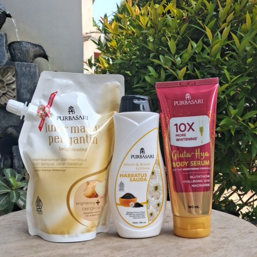 Purbasari Paket 3 Pcs Lulur Mandi Pengantin Bengkoang 500 gr+ Hand Body Lotion Habbatusauda 200 ml + Body Serum Gluta Hy