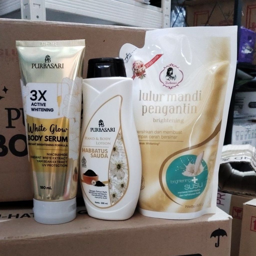 Paket 3 pcs Purbasari Body Serum White Glow 180 ml + Hand Body Lotion Habbatussauda 200 ml + Lulur Pengantin Susu 500 gr