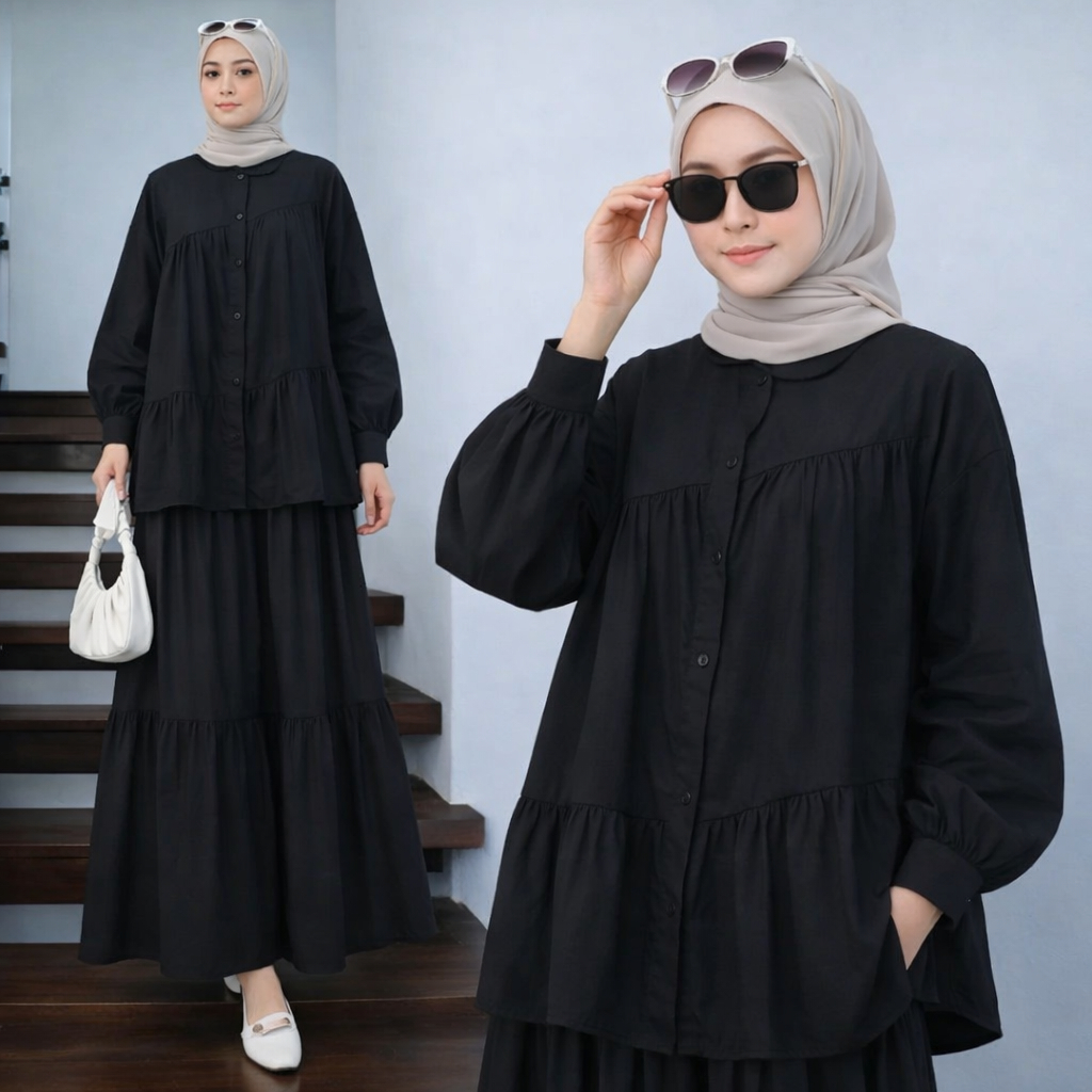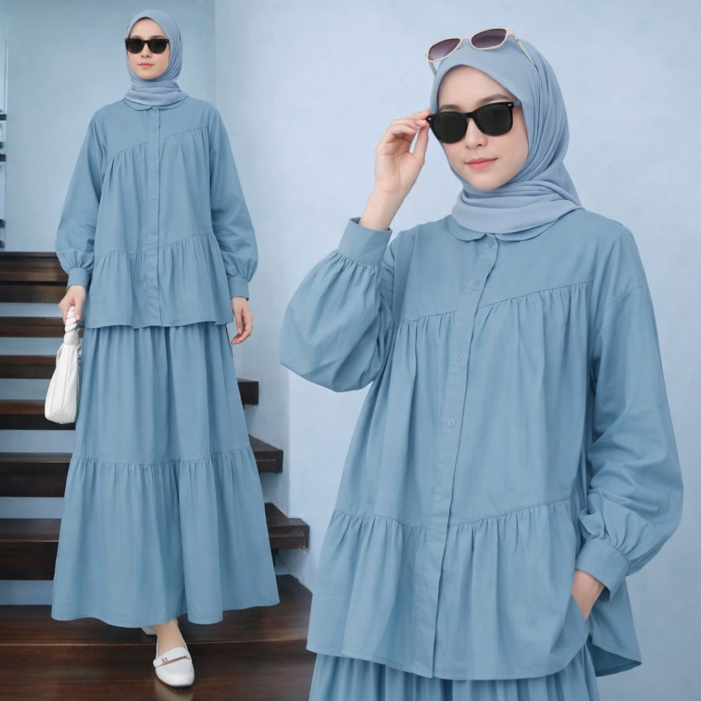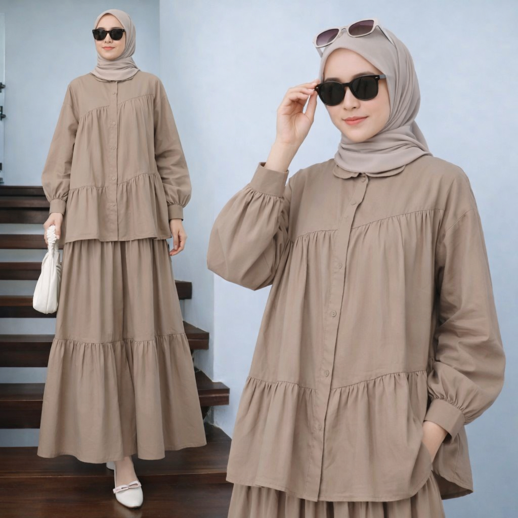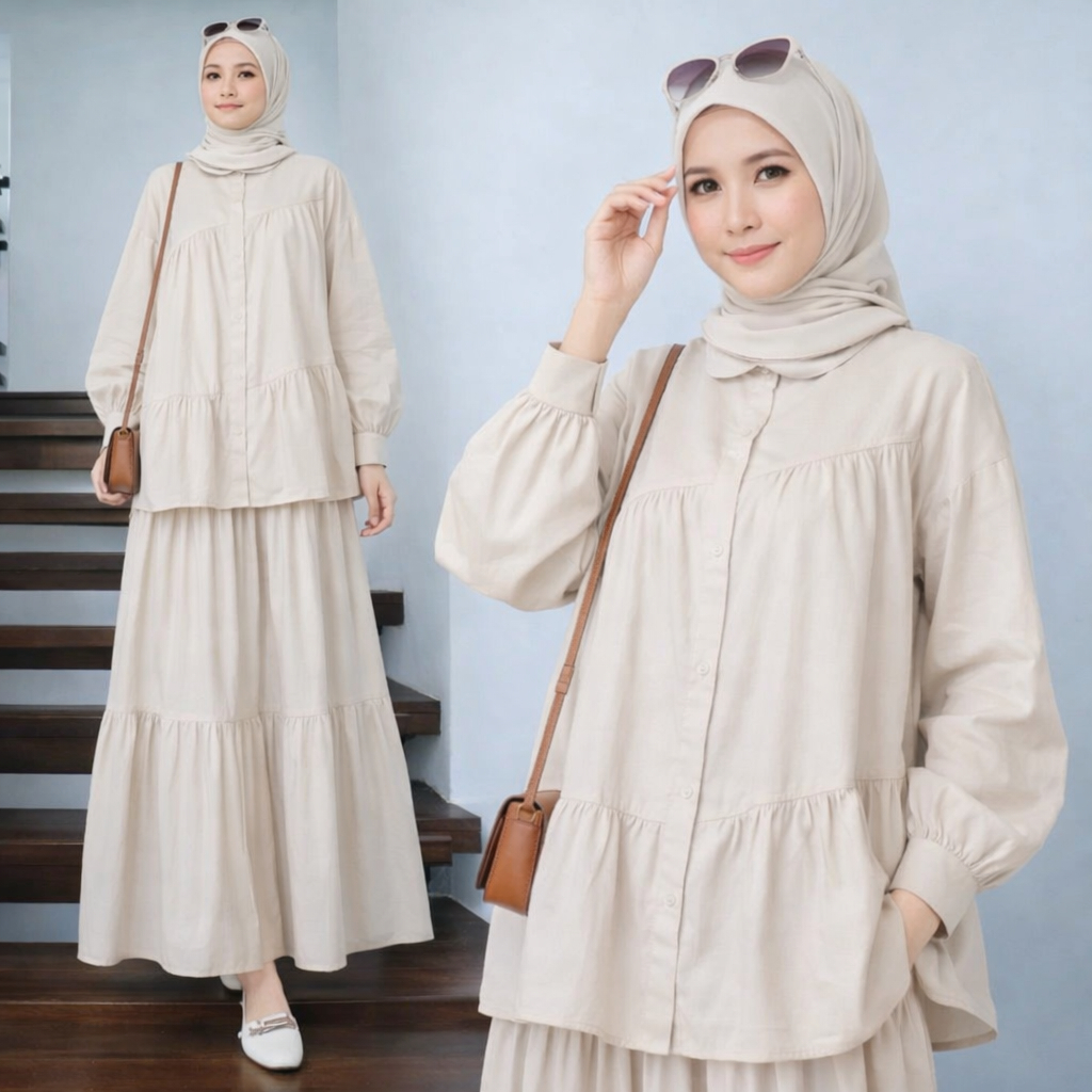 Vallina Outfit Caterine Set 2in1 Setelan Rok Wanita Muslim Remaja Linen Rami Premium Lebaran