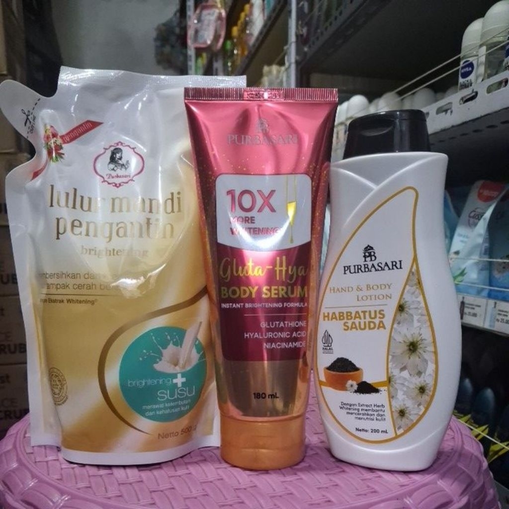 Paket 3 Purbasari lulur pemgantin susu 500 gr + Body Serum Gluta Hya 180 ml + Hand Body Lotion Habbatusauda 200 ml