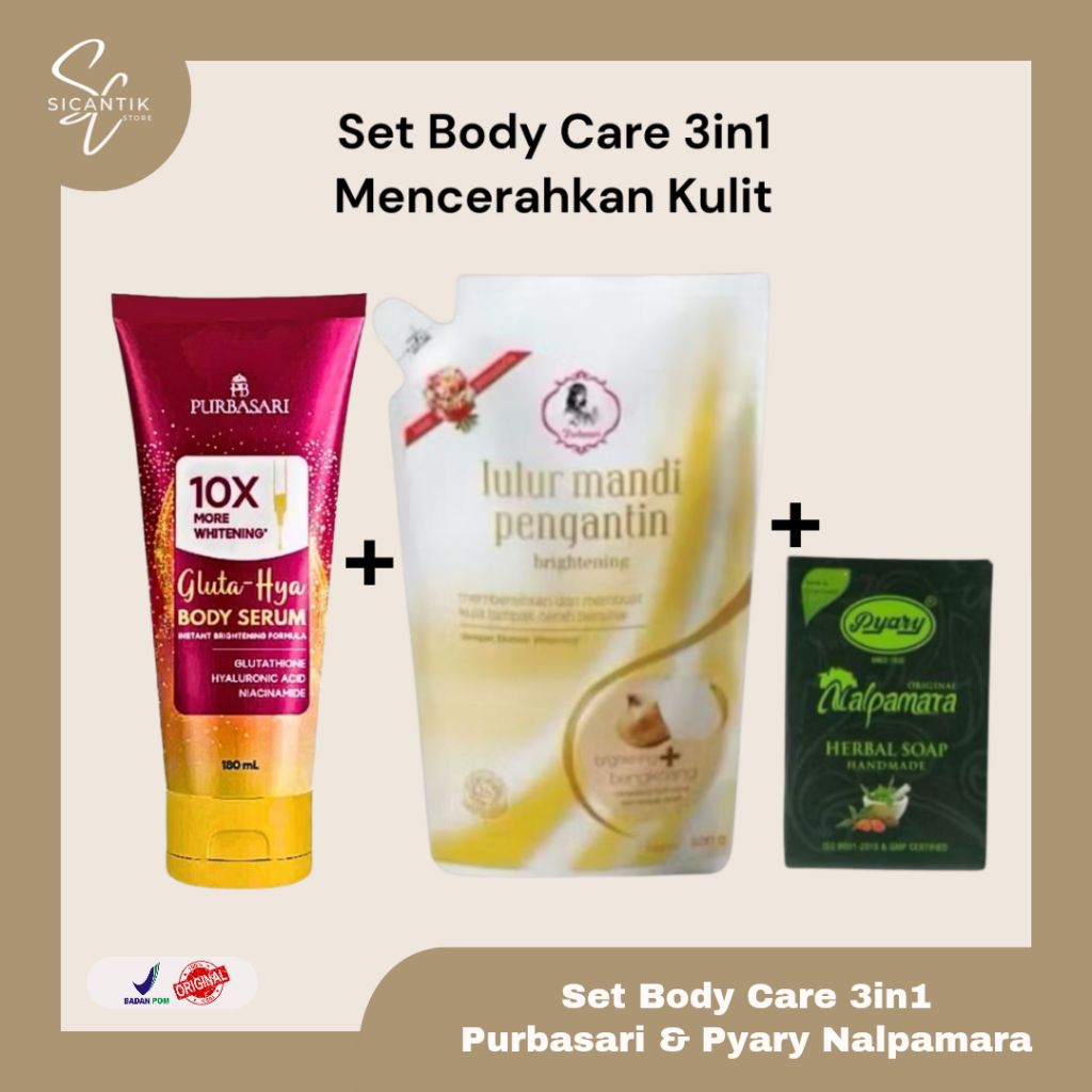 Paket Set Isi 3 Pcs Body Care Purbasari Body Serum Gluta Hya + Lulur Mandi Pengantin 500 gr + Pyary Nalpamara Herbal Soa