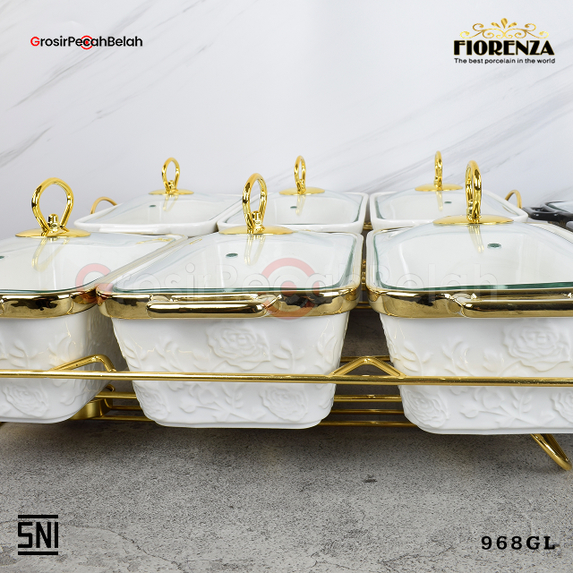 Fiorenza - Prasmanan Wadah Saji Penghangat Makanan Keramik Set Casserole Tempat Basi Elegan Tahan Panas & Estetik Kitchenware | Motif Marbel Lining Gold Emboss Rose Gold 968