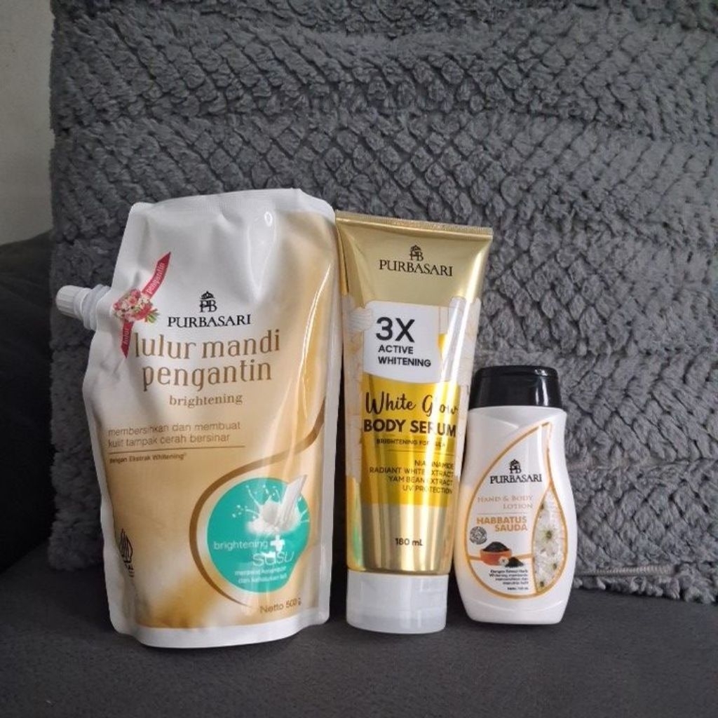 Purbasari paket perawatan tubuh 3Pcs Lulur Mandi Pengantin susu 500 gr + Body Serum White Glow 180 ml + Hand Body Lotion