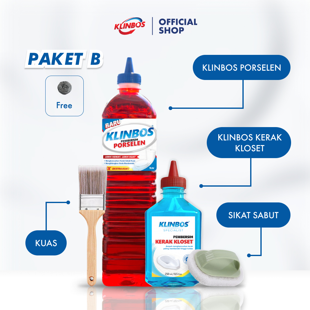 KLINBOS Paket Kinclong + Kuas + Sikat Sabut Pembersih Kerak Untuk Kamar Mandi Keramik Toilet Kaca Wc