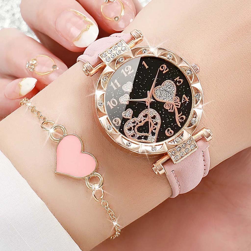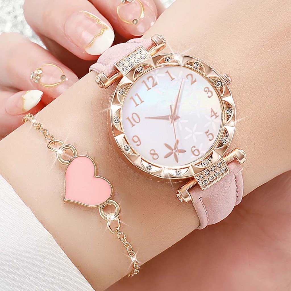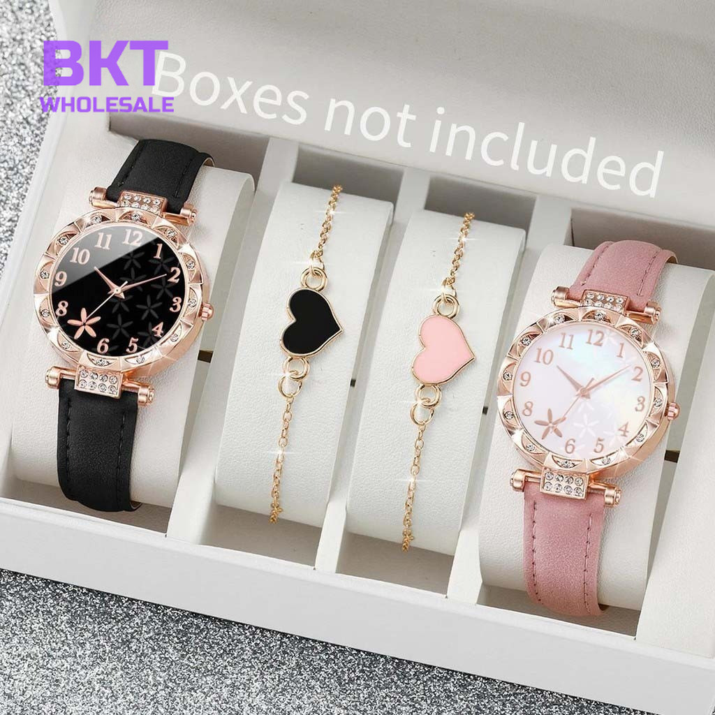 4PCS Set Jam Tangan Wanita Mode Bunga Dial Jam Tangan Kuarsa Jam Tangan Kulit Gelang Jantung Set - Tanpa Kotak
