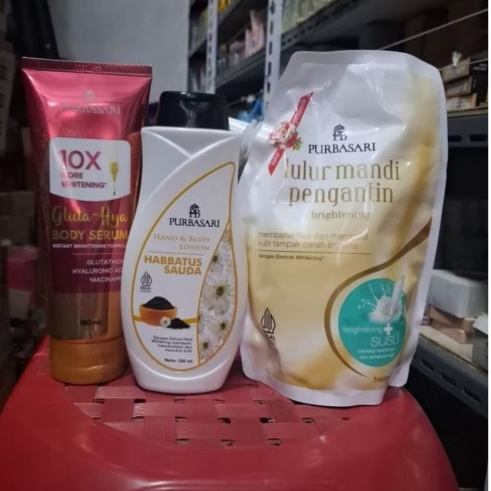 3Pcs Purbasari Body Serum Gluta Hya 180 ml + Hand Body Lotion Habbatussauda 200 ml + lulur Pengantin Susu 500 gr