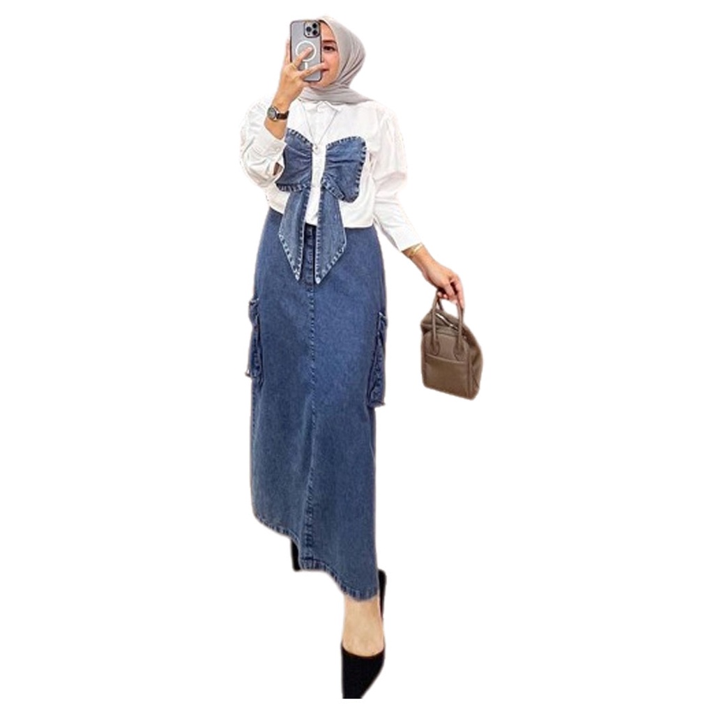 Vallina Outfit - Ribbon One Set Skirt Pita Buffy Jeans Top Toyobo Baju Setelan Rok Wanita Muslim Modern Kekinian Premium