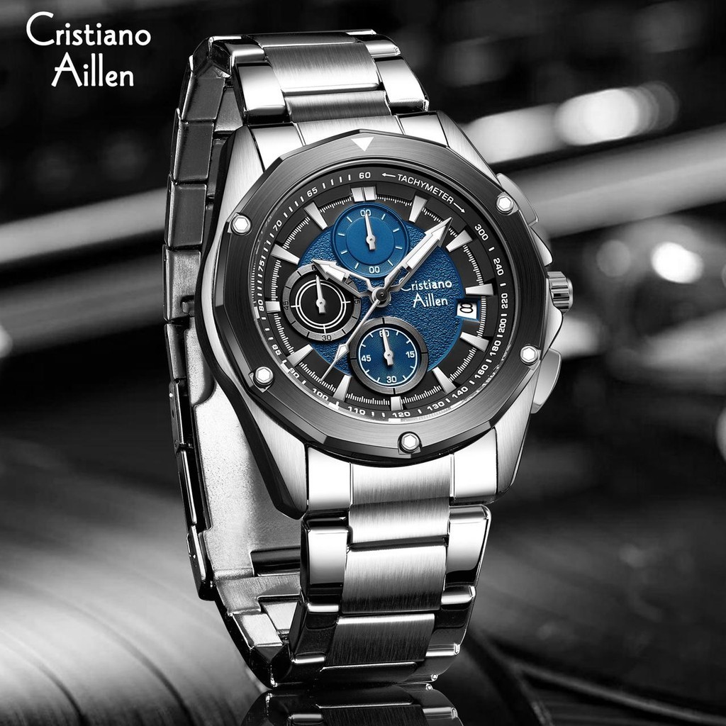 Ori Cristiano Aillen Jam Tangan Pria Analog 8899 Rantai Stainless Steel Chronograph Kaca Sapphire Water Resistant 3 ATM