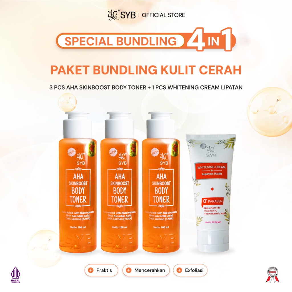SYB BUNDLING 4IN1 (3PCS NEW SYB AHA SKINBOOST BODY TONER DNA SALMON + 1PCS SYB WHITENING CREAM LIPATAN KULIT)