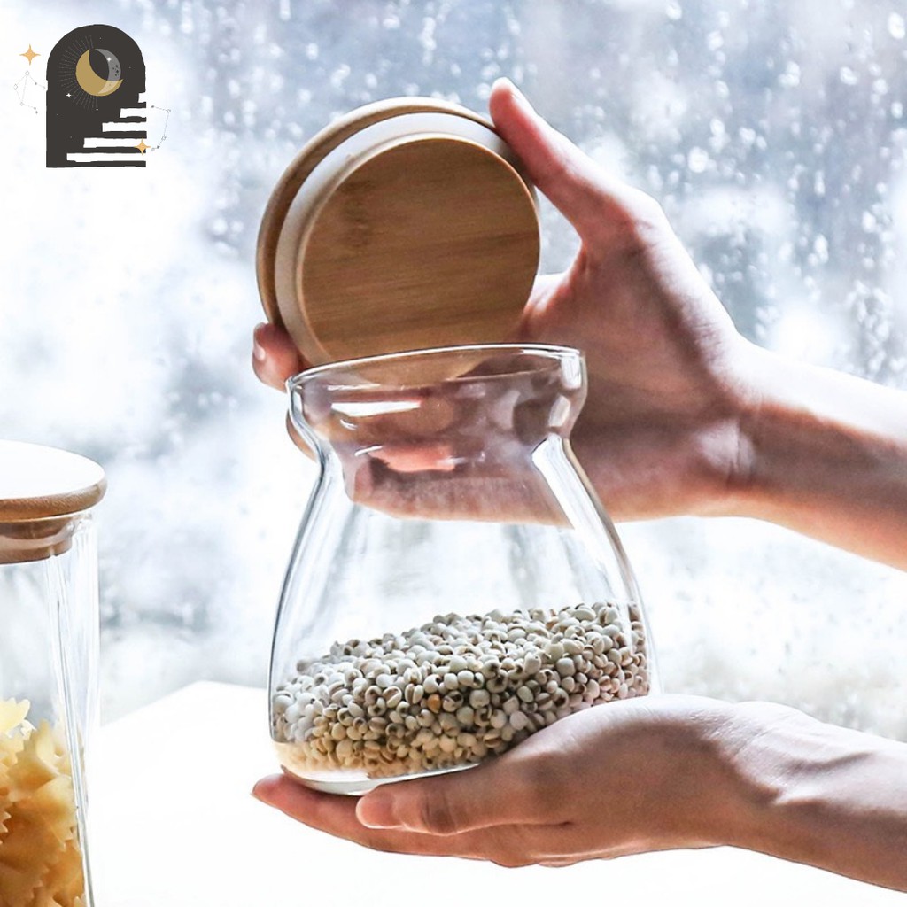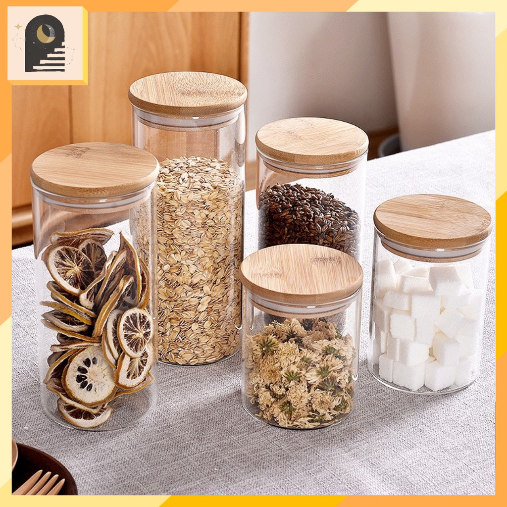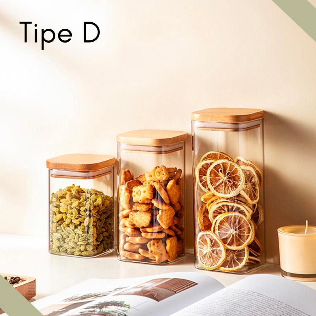 EITHER.ID Toples Makanan Ringan Tutup Kayu Toples Bumbu / Snack Jar Kaca Borosilicate Glass Jar Premium