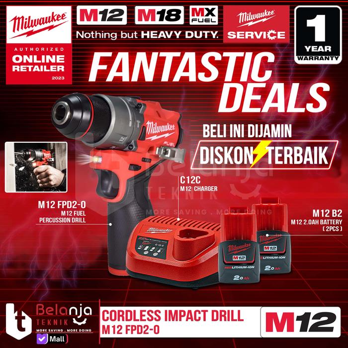 Milwaukee Bor Beton Baterai M12 FPD2-202 Cordless Impact Drill 12V Set 2 AH FPD dengan E-Clutch &